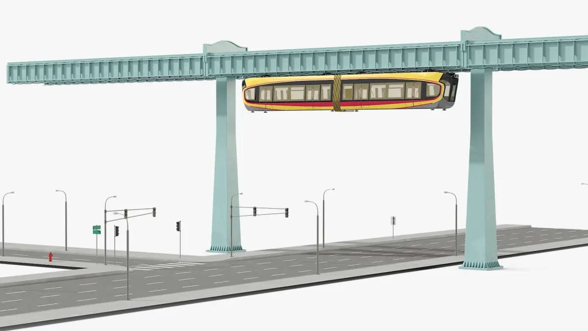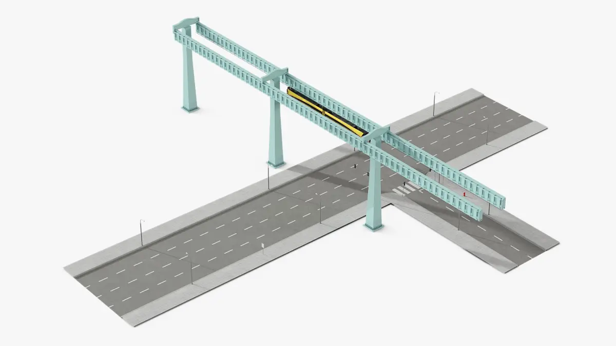 Urban Suspended Monorail and Highway is a three-dimensional model of suspended monorail air train or suspended monorail sky train, designed for both commercial passenger commuting and sightseeing.