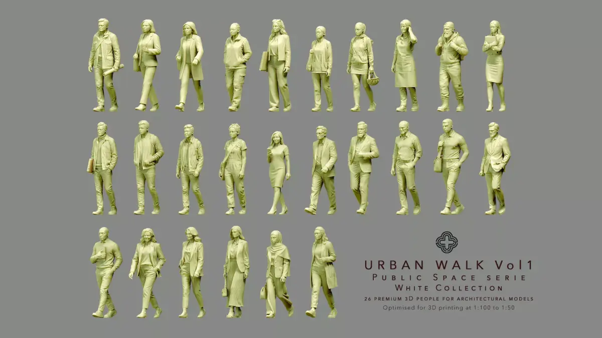 Urban Walk Vol. 1 - Public Space Collection is a set of 26 architectural figures that capture the energy of people moving through the city on a workday. These characters walk with a more determined pace than the Leisure Walk set - commuters heading to the office, shop owners and artisans on the move, people on their way to meetings or running errands in dense urban areas.