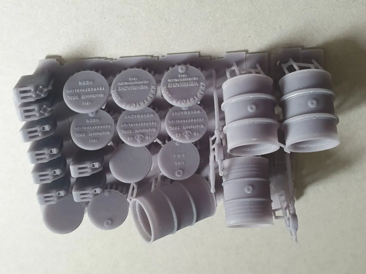 A selection of 3 types of WWII fuel Barrels, a selection of German, US and plain Barrel Lids, German and US Gerry-cans, and two types of hand pump. Each part is positioned ready for 3d printing on a RESIN printer. Ready for automatic addition of supports. This works well on an Elegoo Mars Pro II sized printer if printed at 1/32 scale or smaller. In addition are all parts are provided as separate objects, and a zip file containing all object files is available.NOTE: A new corrected file for more accurately sized German fuel barrels has been included as separate files in stl & blender format. See Fuel_Drums_German_Separate-updated.