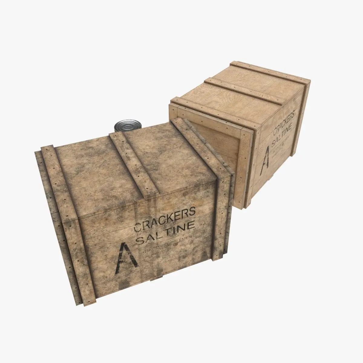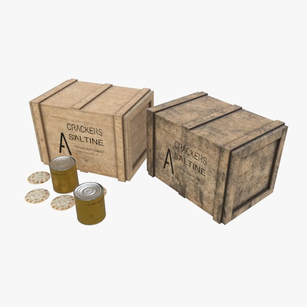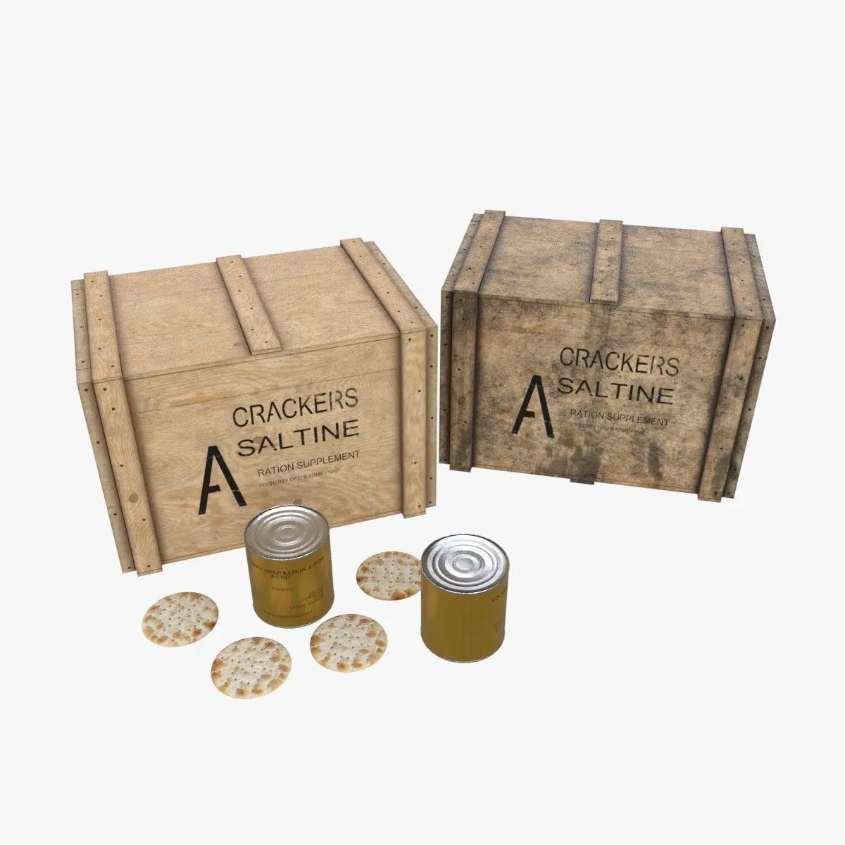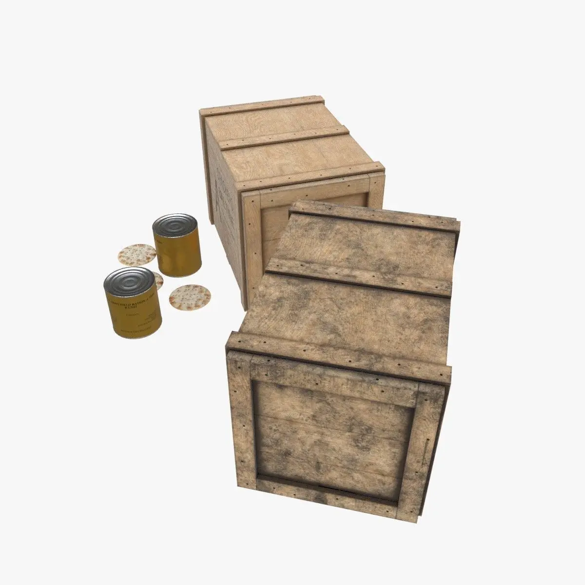 This is a model of a US army crackers storages used during the Second World War to ship the famous Crackers biscuits to the front. This is B-Units cans from combat rations of Type K. The model include 2 versions of the wooden crate (clean & dirty). It is including the tin can and the biscuit models too.