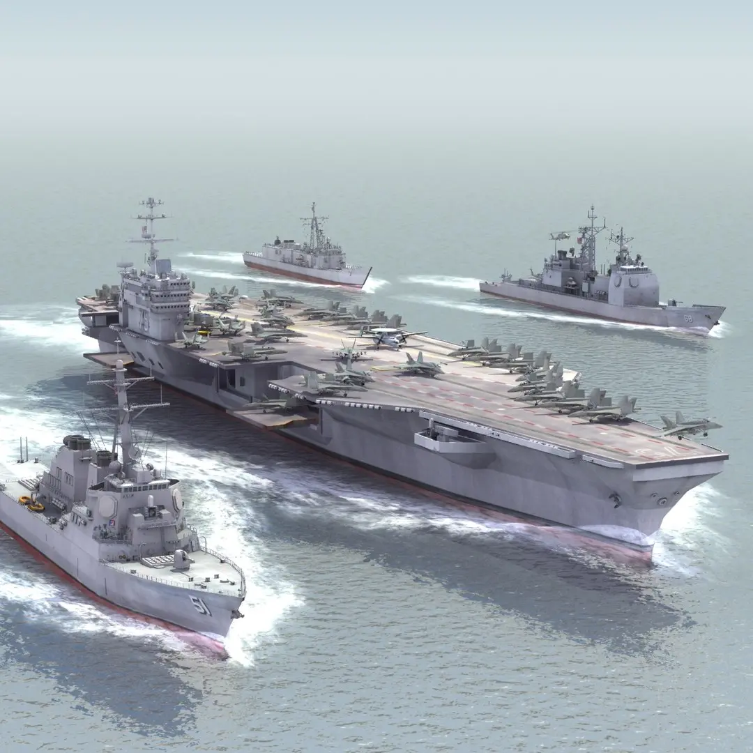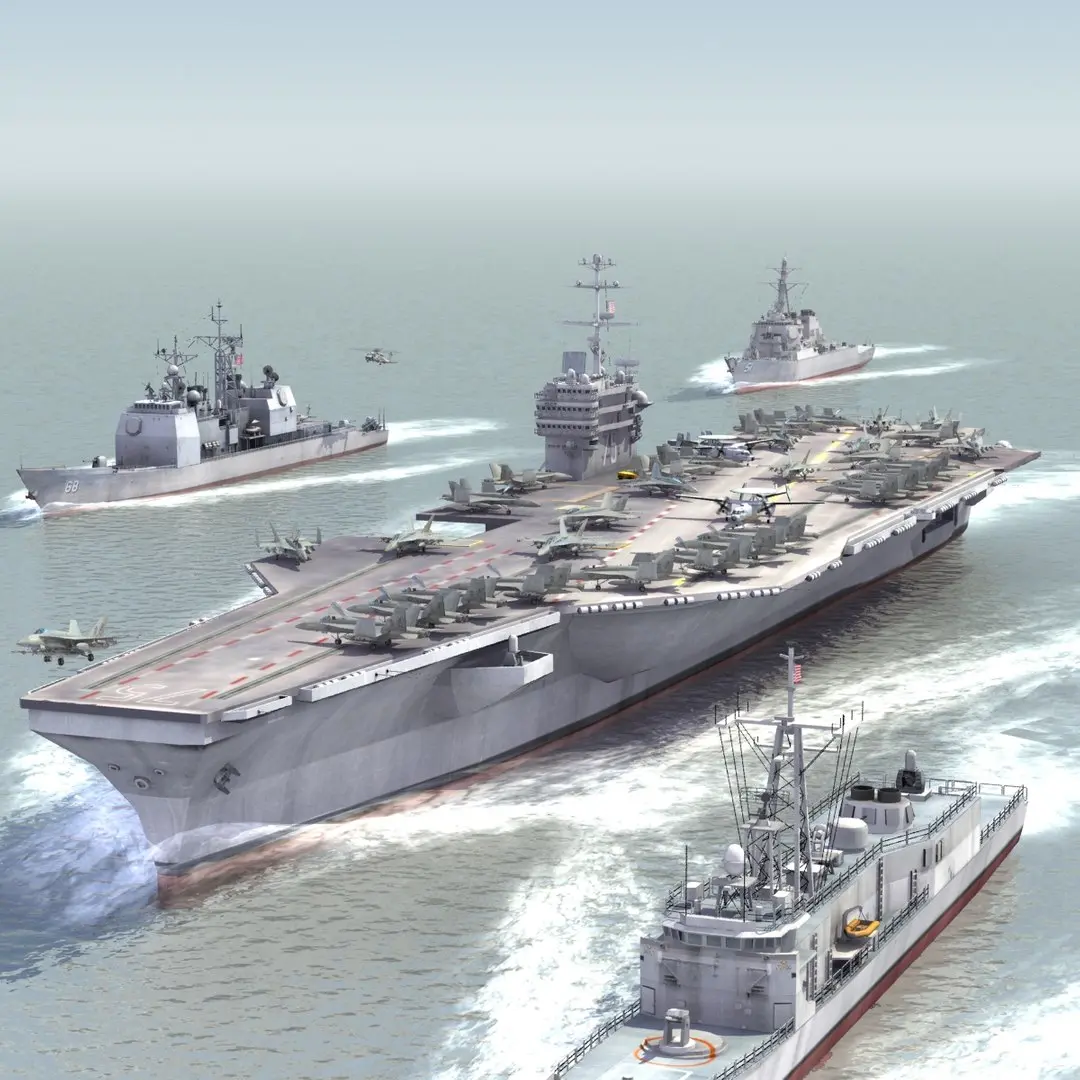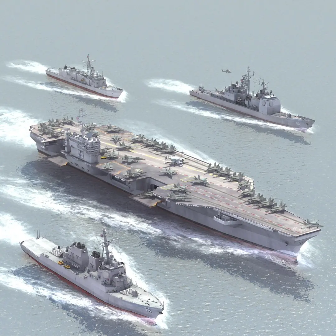 Aircraft Carrier Strike Group of the United States Navy. Includes full carrier air wing (F/A18E, EA18G, EC2, UH60B), plus CG68, DDG51 and FFG07. This set is part of a huge collection available from ES3DStudios. Animated bow wake is available as a separate product - ID 551816, or static wake - ID 281872