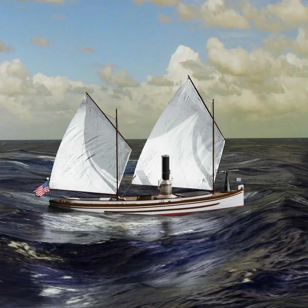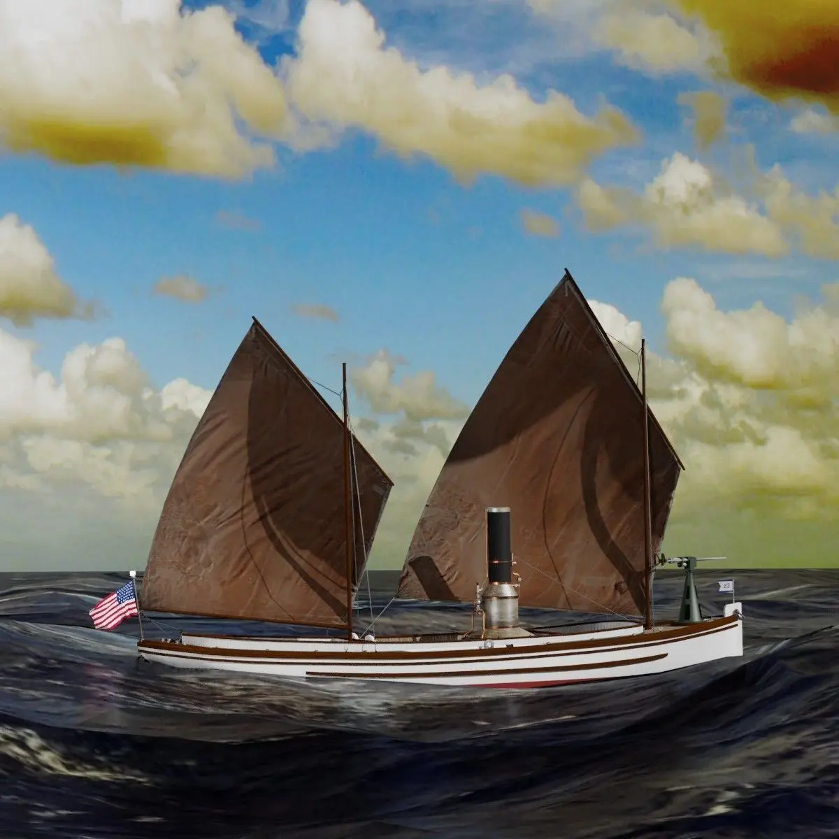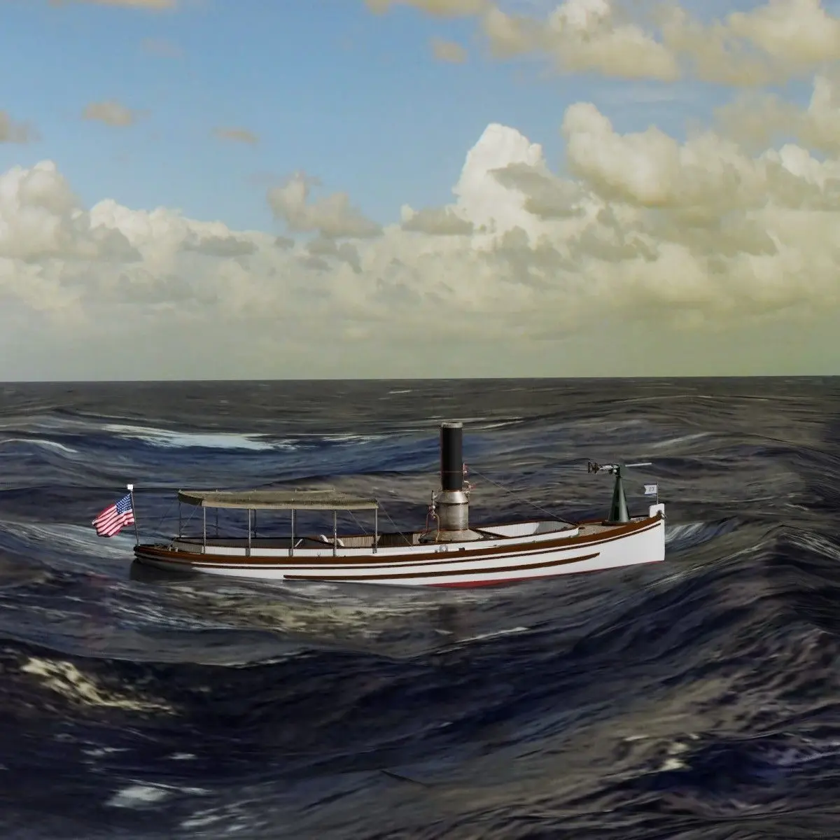 The Model includes a simple sea/sky background.Sails or tent arrangement can be easily activated using both groups present in the diferent files.