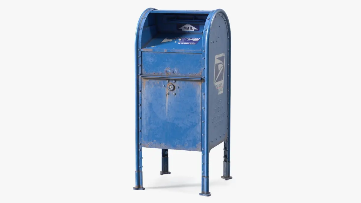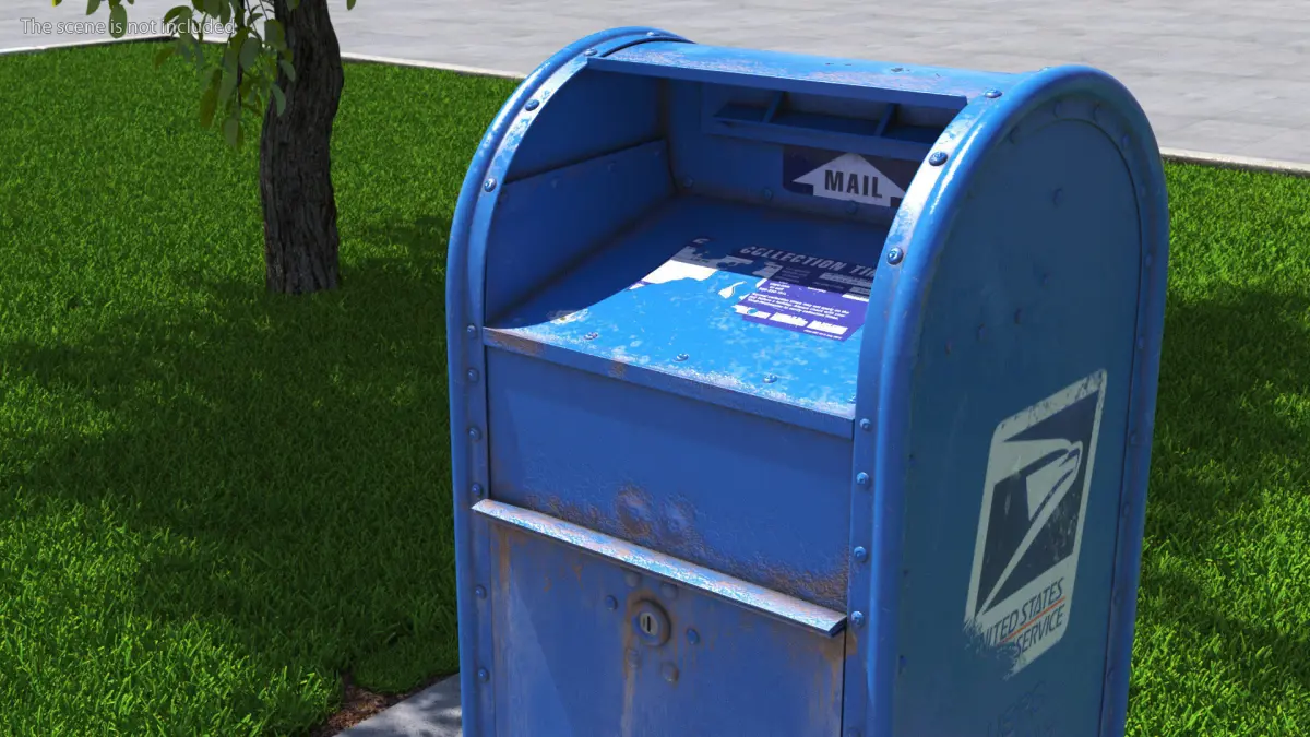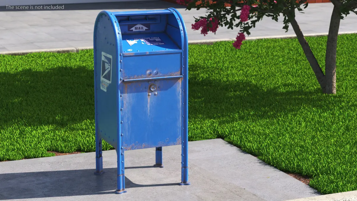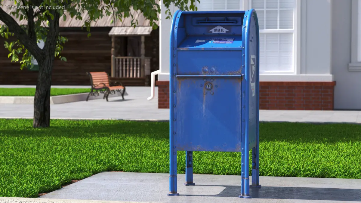 US Postal Mail Box Aged is a 3D model of street mail managing device which is a popular, widespread street mailbox, which is locking container which designed for outgoing post store and shipping.Old, worn out, blue metal mail box which is a street postal service item, and which is a specialized security locking post, and which is a widespread public street mailbox device (equipment). Outdoor metal mailbox storage accessory which is container type mail equipment used to outgoing letter mail items (envelope type mailing correspondence) storing. For post communication services, postal delivering service equipment, express delivery services, mail services, mail transportation, postal service container accessories, postal delivering service equipment, post shipping equipment, post systems, and mail business promotional projects.