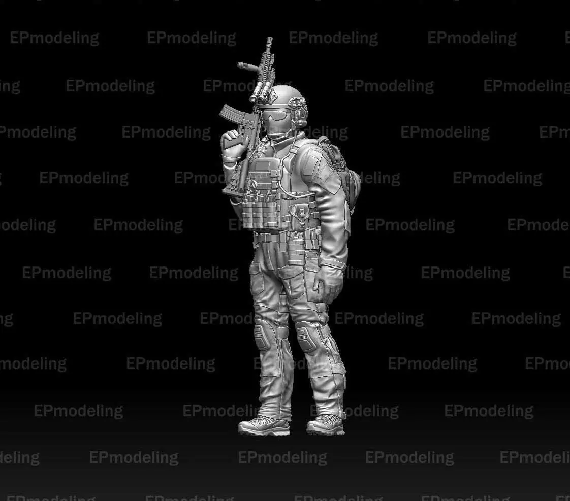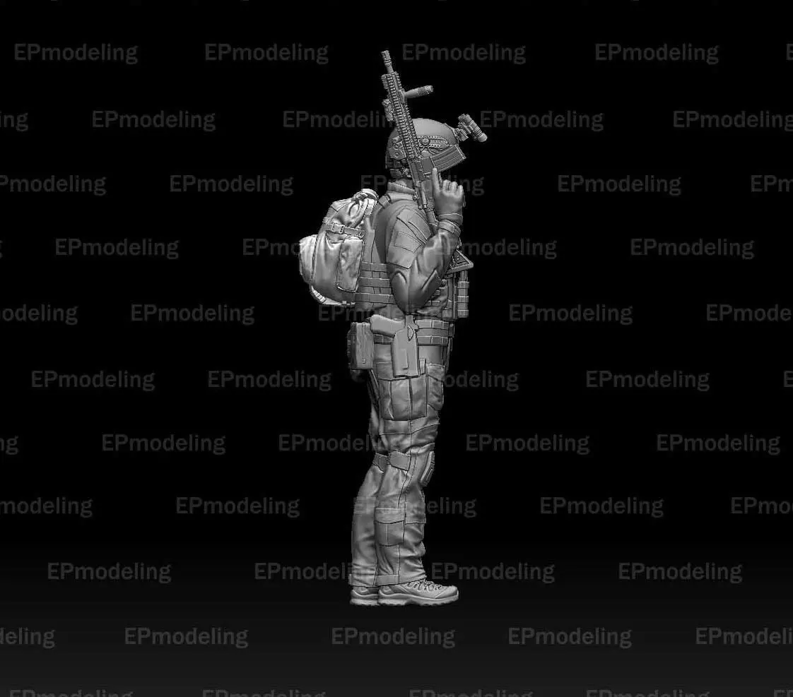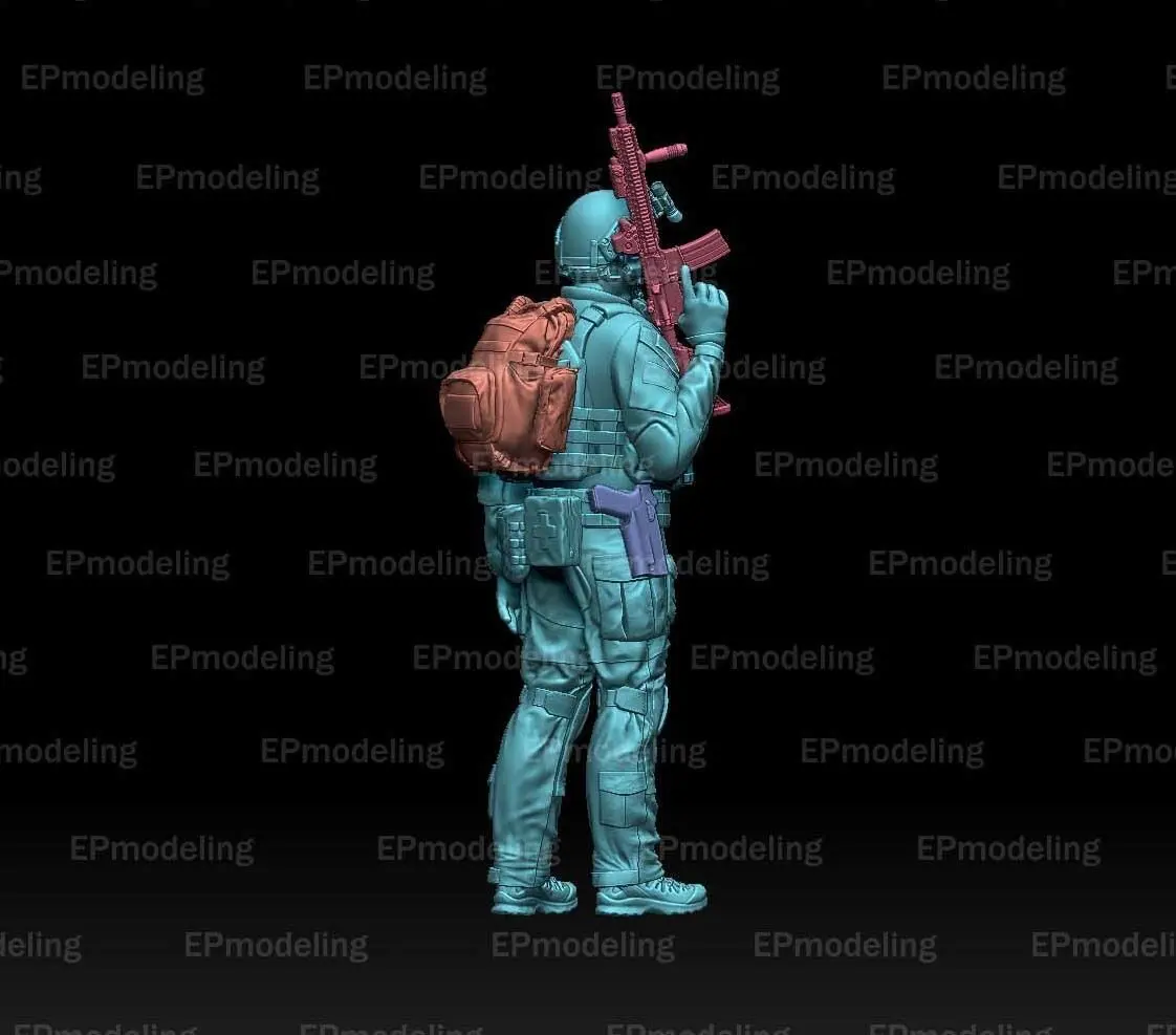 The format is OBJ,STL.Scale 1:16. Ready for print.The 3D model has four parts: a backpack, Assault rifle, a holster with a pistol, and a body.