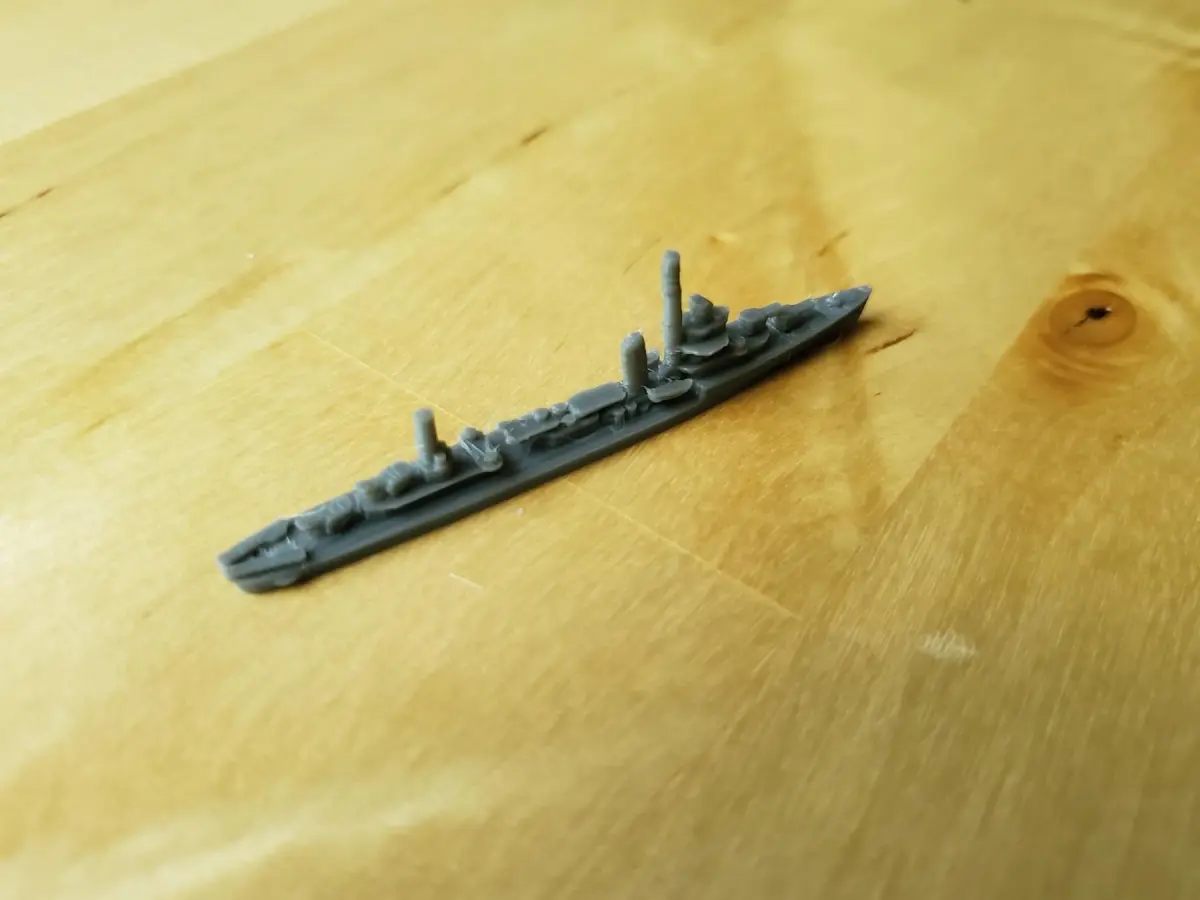 This model is designed and tested at 1/1800th scale, but up-scaling and down-scaling are possible. Since the model is optimized for 1/1800th scale, it is not ideal to print much larger versions due to a lack of detail. The gun barrels and mast have been enlarged.