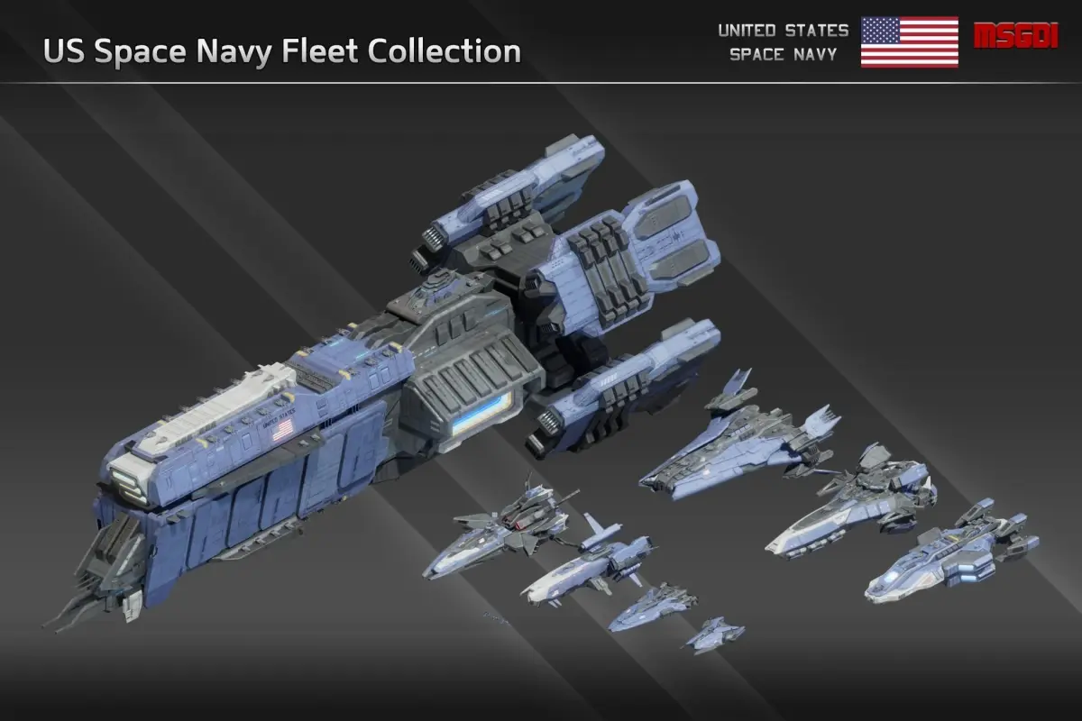 This pack contains a collection of all ships of the US Space Navy. Each spaceship has modular weapons and bridge, engine and side modules. The ships can be used in a space themed game.