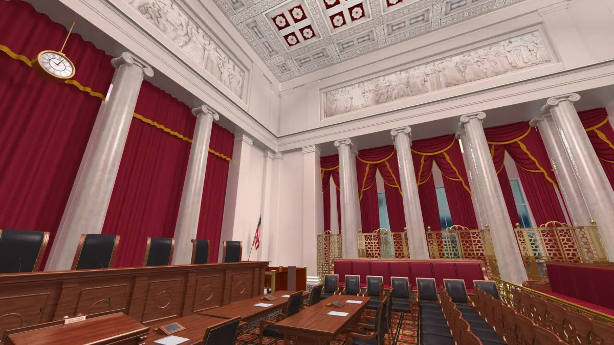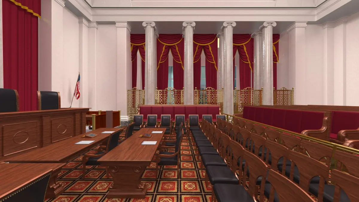 Detailed model of U.S. Supreme Court interior courtroom.