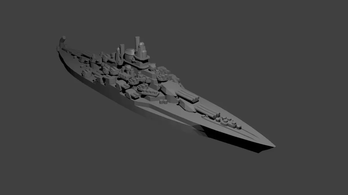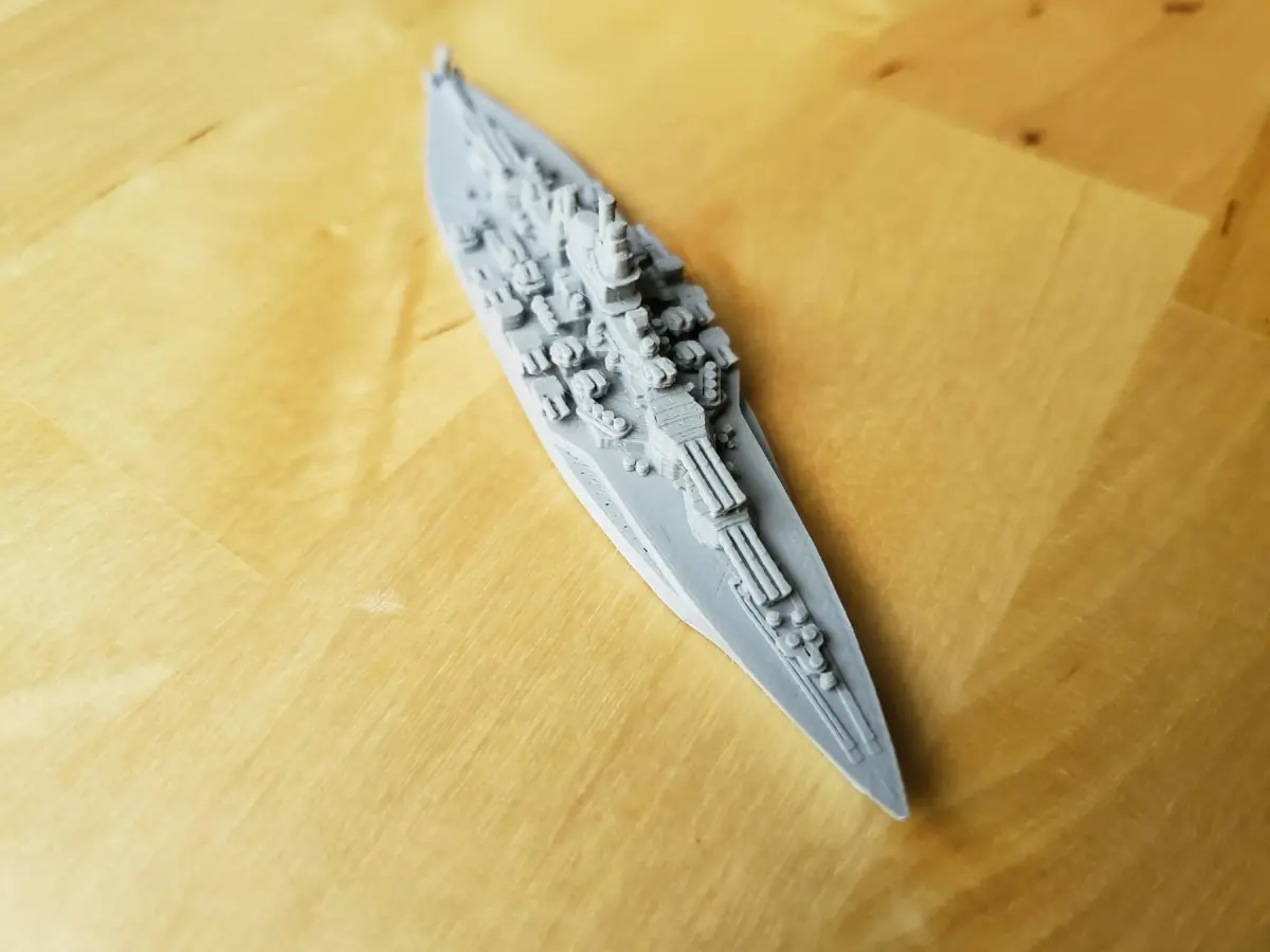 This model is designed and tested at 1/1800th scale, but up-scaling and down-scaling are possible. Since the model is optimized for 1/1800th scale, it is not ideal to print larger versions due to a lack of detail. The gun barrels and mast have been enlarged.