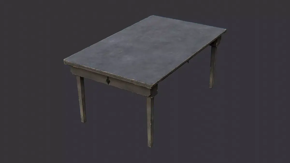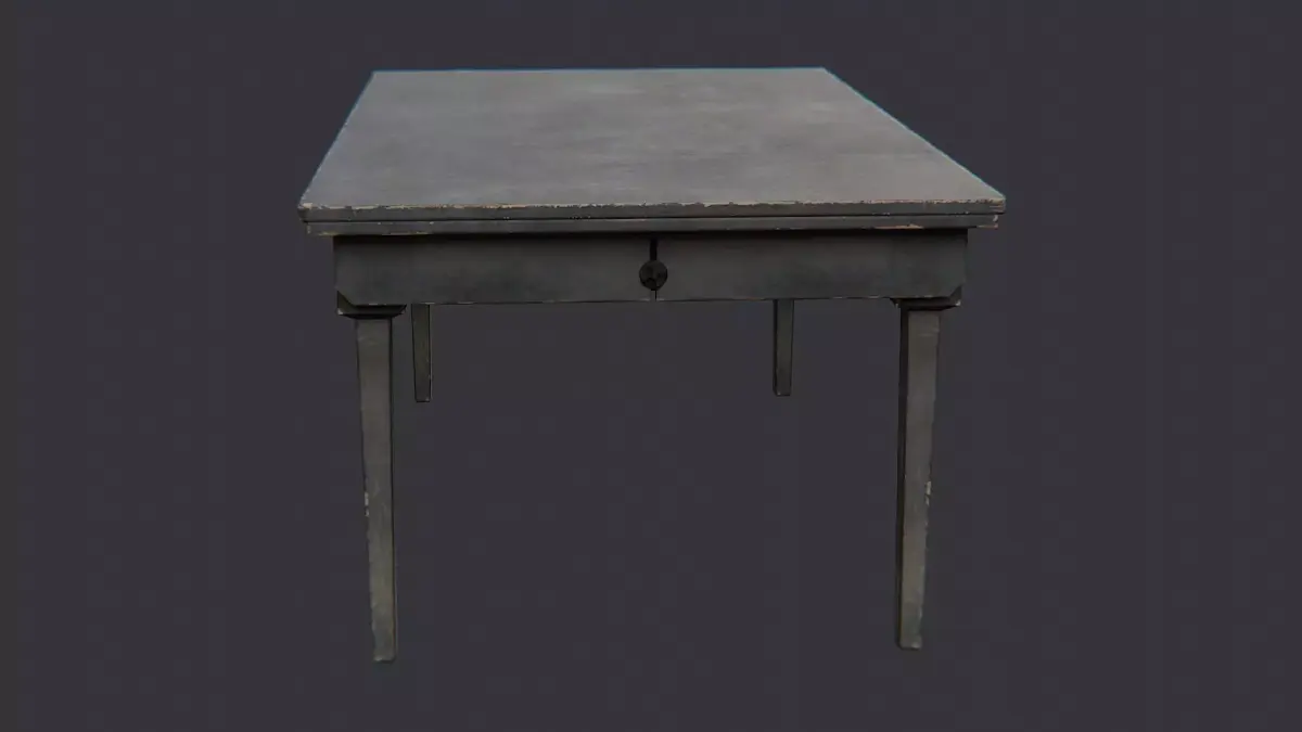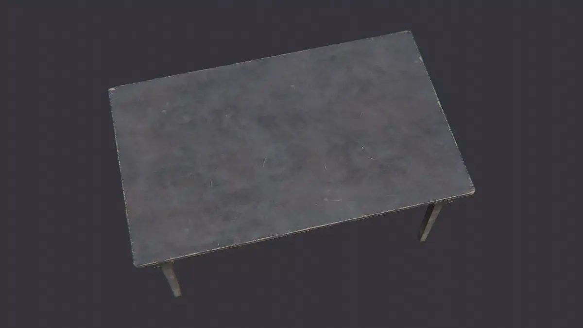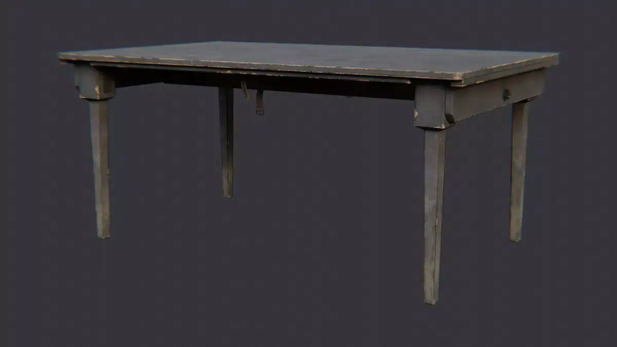 A weathered wooden barracks table with a dark, matte finish and sturdy square legs. The planked top shows subtle wear, chips, and a rugged texture that adds realism to military interiors. Ideal for bunk rooms, mess halls, or training environments in architectural visuals and game scenes using a single durable material.