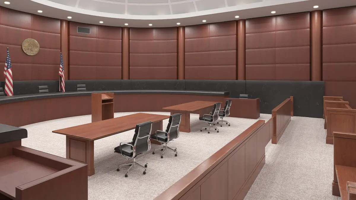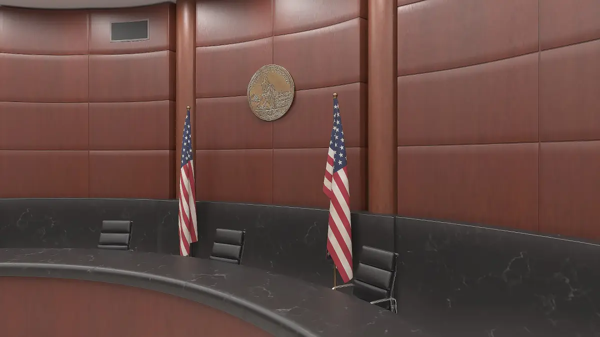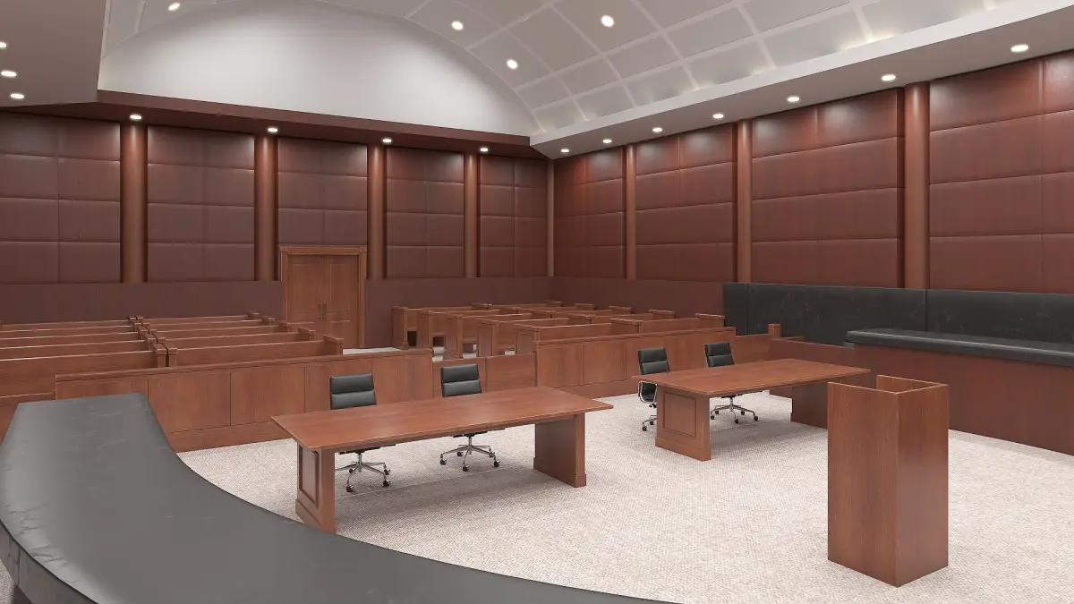 USA Courtroom Interior is a three-dimensional model of U.S. courtroom that features a judge's elevated bench at the front, facing the audience.