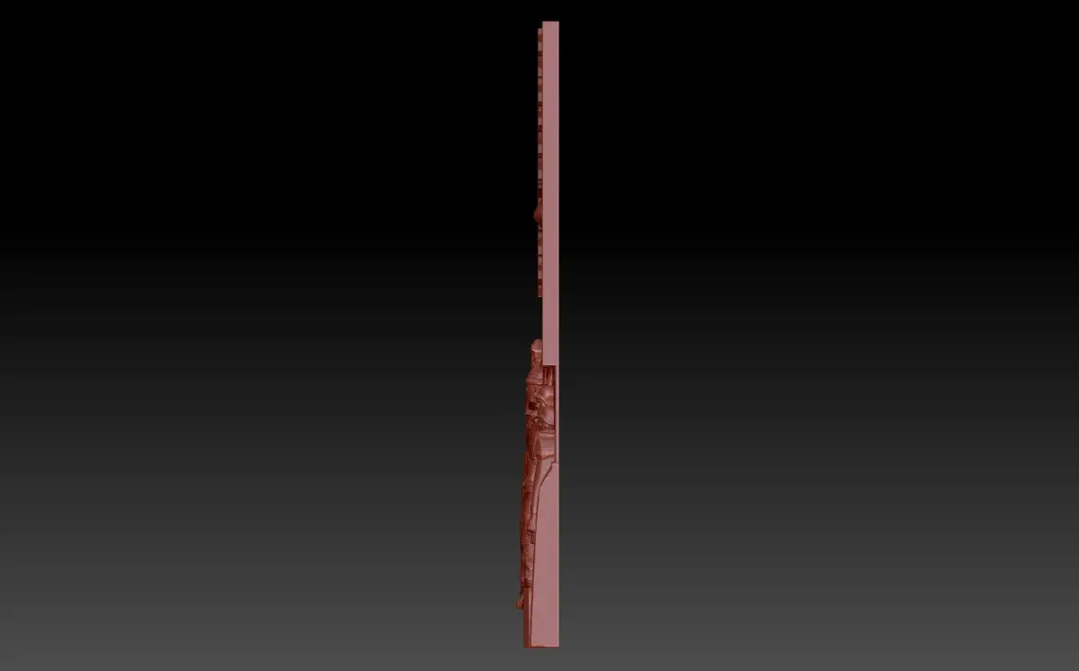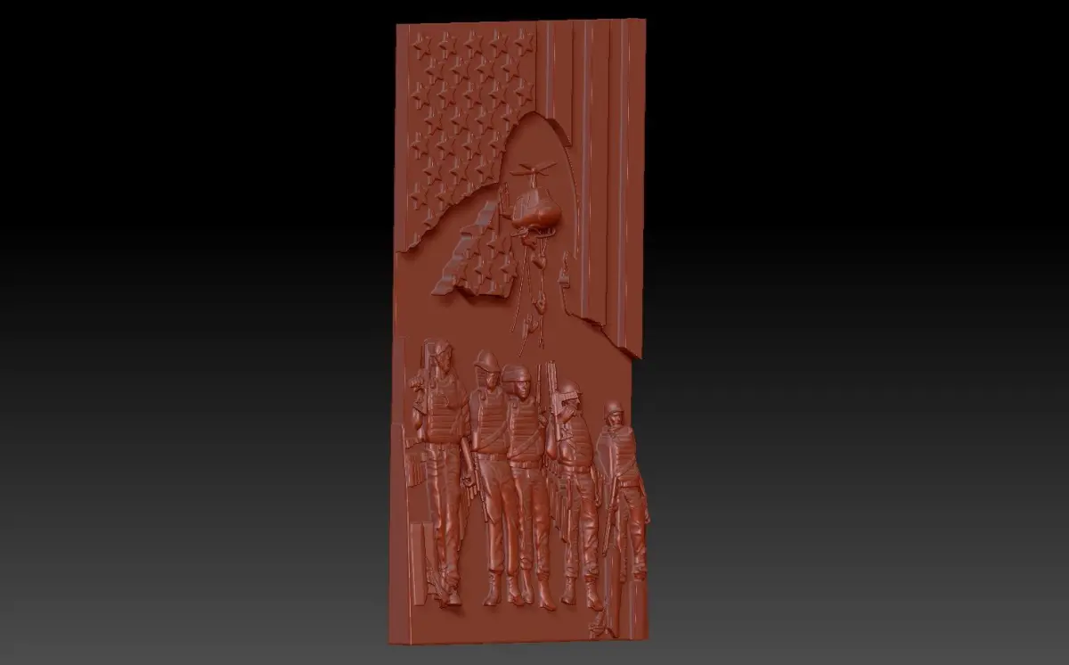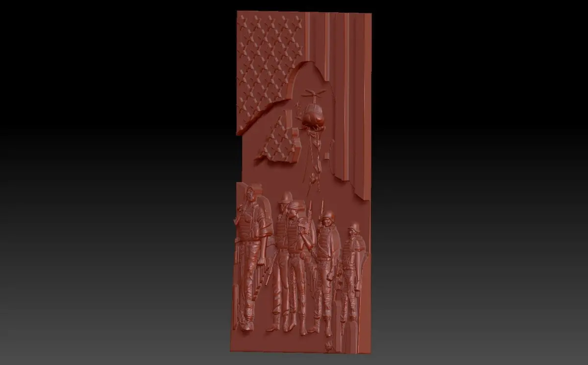 A 3D model of the project, which depicts a bas-relief dedicated to the theme of the American army. In the foreground we see soldiers, and in the background there is an American flag and a helicopter, also filled with soldiers. This job is perfect for both 3D printing and numerically controlled machines.