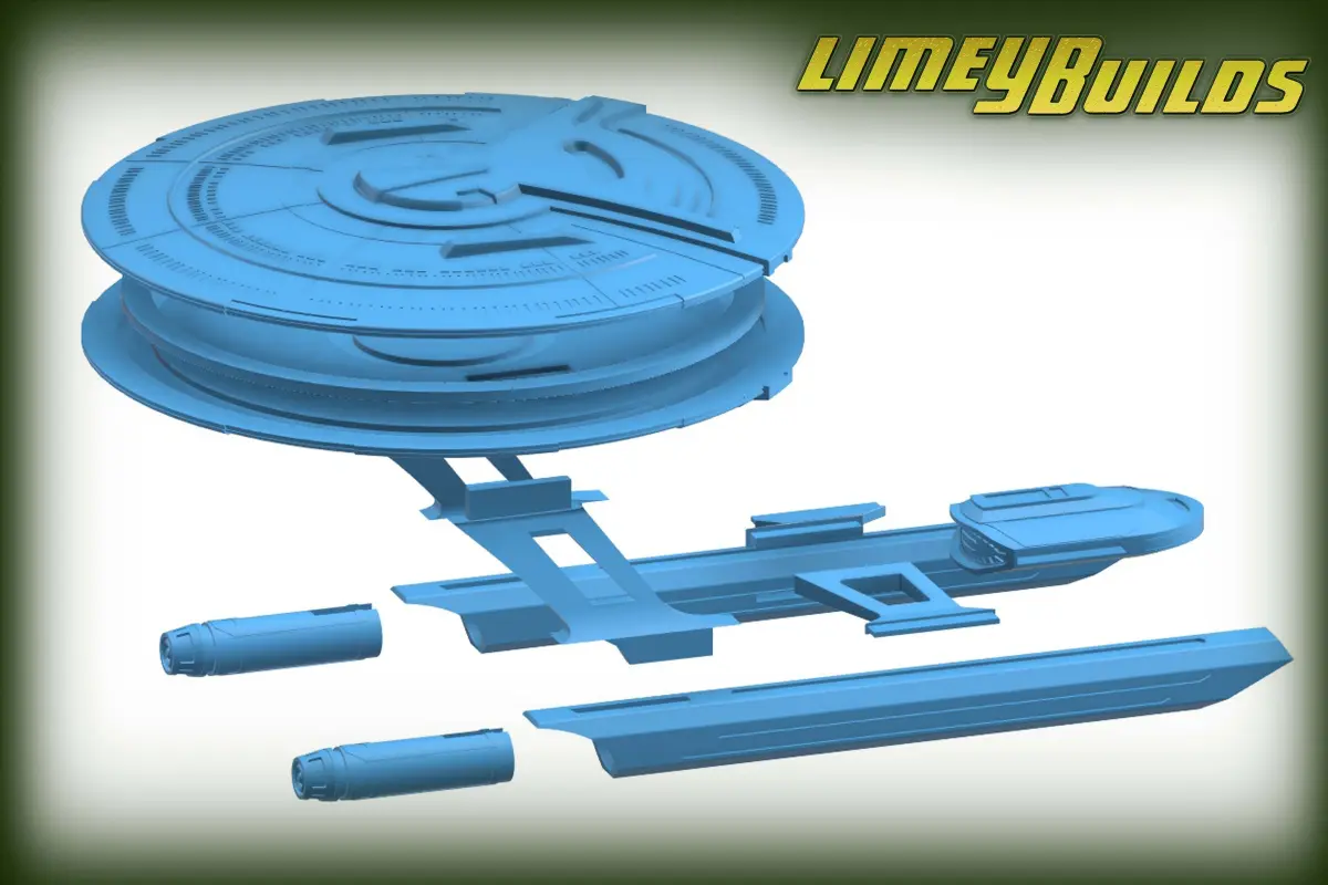 Model of U.S.S. Cerritos California class starship designed for 3D printing and assembly.Approx 300mm long.Parts will fit on 200x200 printer bed*