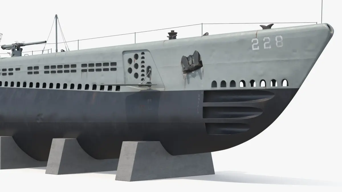 USS Drum SS-228 Submarine on Shipyard Supports is a 3d model of a World War II-era submarine known for its significant contributions to naval warfare.