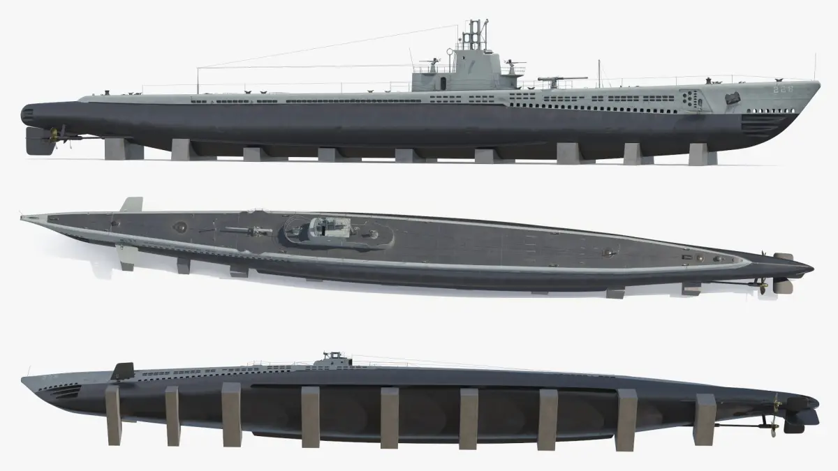 The model features detailed elements such as the conning tower, deck guns, periscopes, and torpedo tubes. The submarine's design showcases the streamlined hull and distinctive sail, which were crucial for underwater stealth and surface navigation. This realistic representation captures the intricacies of the original vessel, perfect for historical and educational purposes.