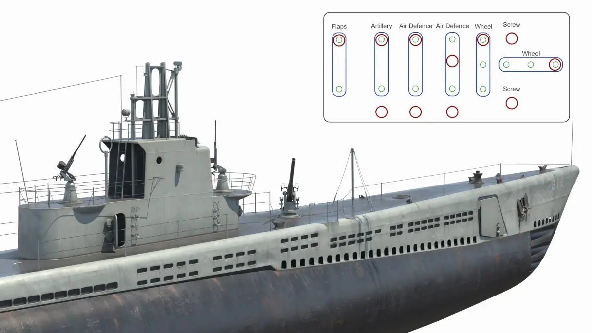 USS Gato SS-212 Submarine Displayed Rigged is fully rigged and is ready to be animated. You can easily position it the way you need or animate it the way your project requires using helpers in 3D Studio Max. See the turntable to get an idea of how rigging works.