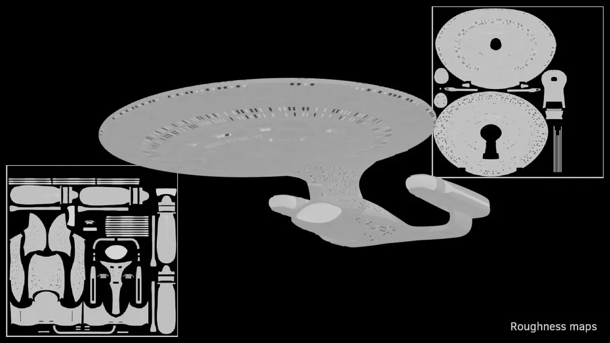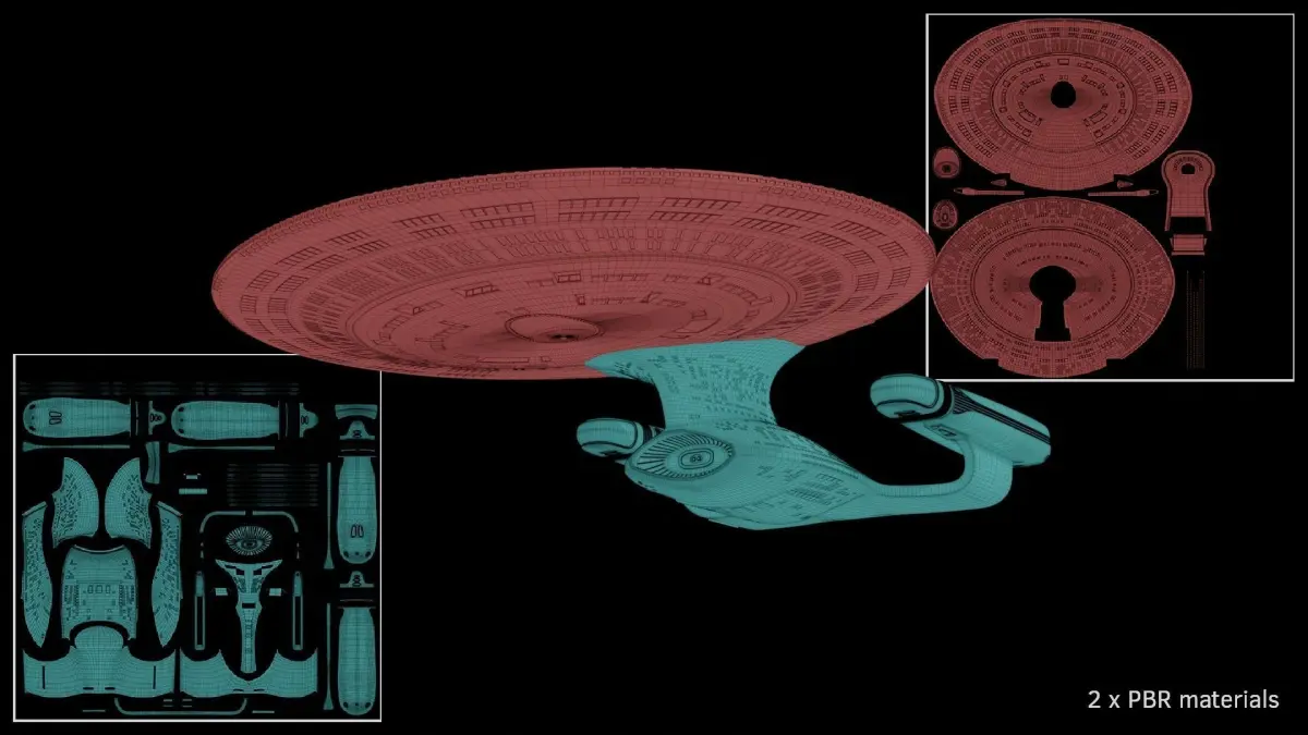 The model uses two separate PRB textures (one for the saucer and one for the engineering section). Both materials come with a base colour map, a roughness map, an emission map and a normal map, all texture maps are 8k (no metallic map is included as the model doesn't need on). A 4k UV layout image is also included for each material. The model is fully UV unwrapped with non-overlapping UVs.
