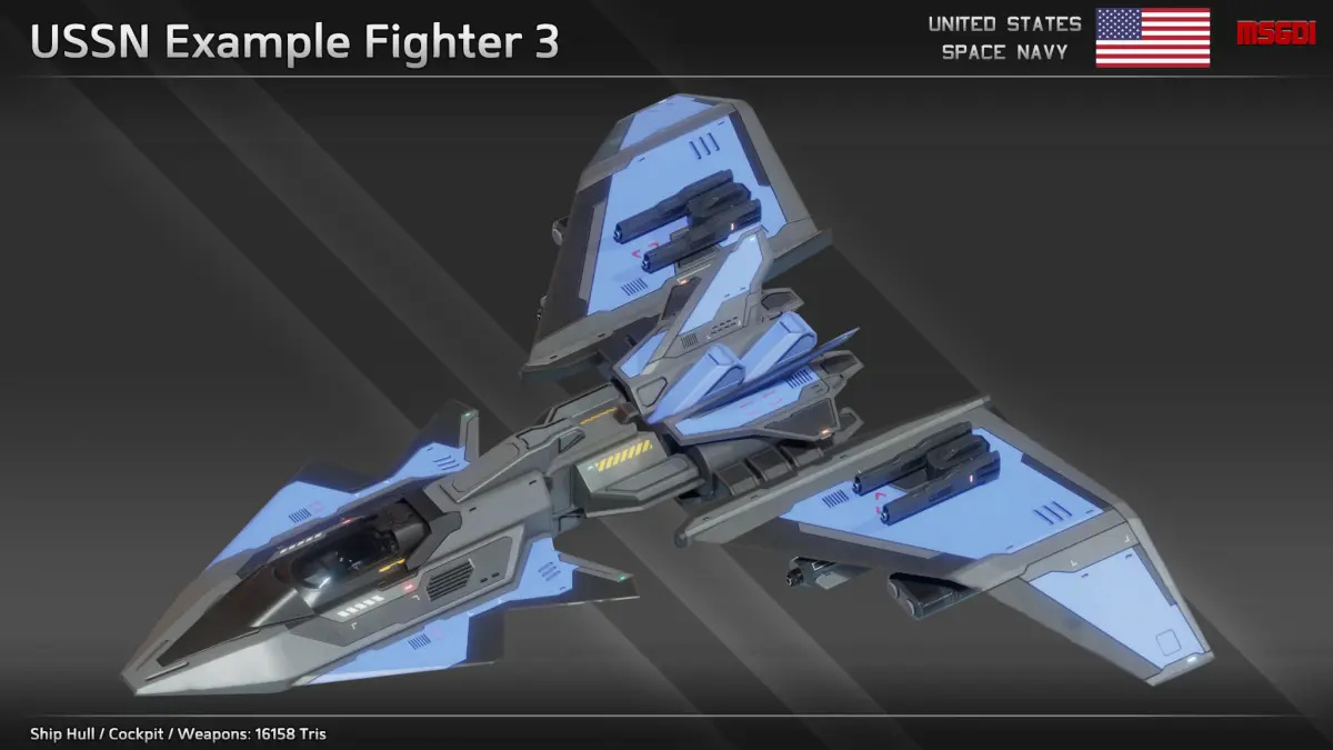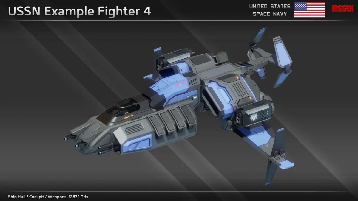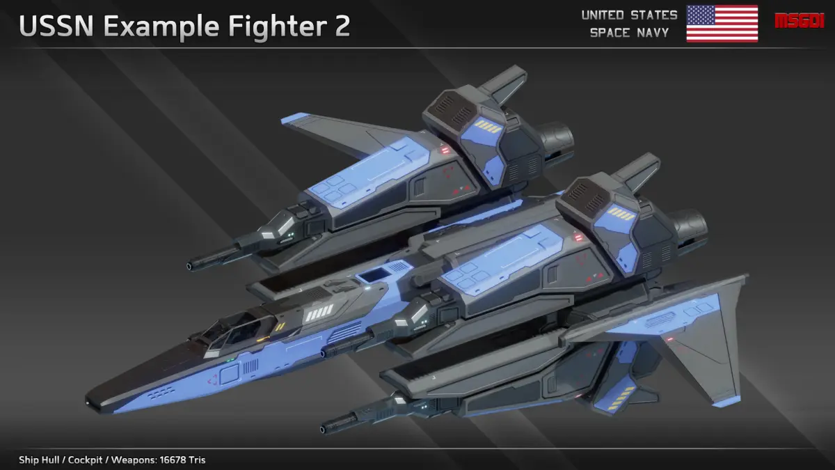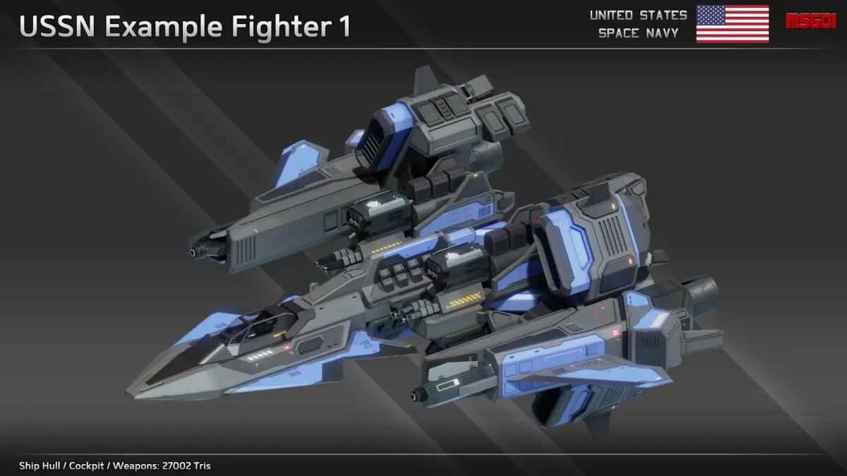 This pack contains a modular scifi fighter kit of the US Space Navy with modular weapons. The spaceships can be used in a space themed game.