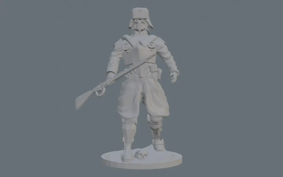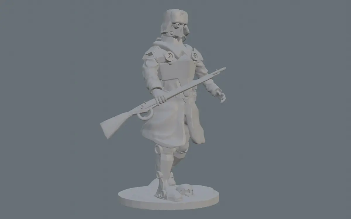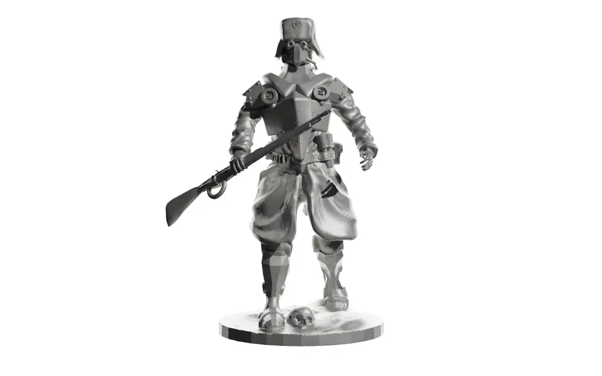 Model for 3D Printer The idea is that the war is not over, in the yard of 2060. The world is defined by war, economies are working on wear and tear, science and technology are aimed at developing armaments. Genomodifications, implants, implantation of various equipment, used to increase the power and survivability of military and civilian. This is the first model in a series of models The war is not over infantry in the USSR. Strong armor, modified legs, optics implanted in the eyes, firing a mosin rifle. The multi-backpack allows you to do jet jumps, saves extra power for the modules, and there are nutrients that provide food for a week at full capacity. This is one of the simplest infantry modifications of the USSR.USSR Red Army infantry 3D Model