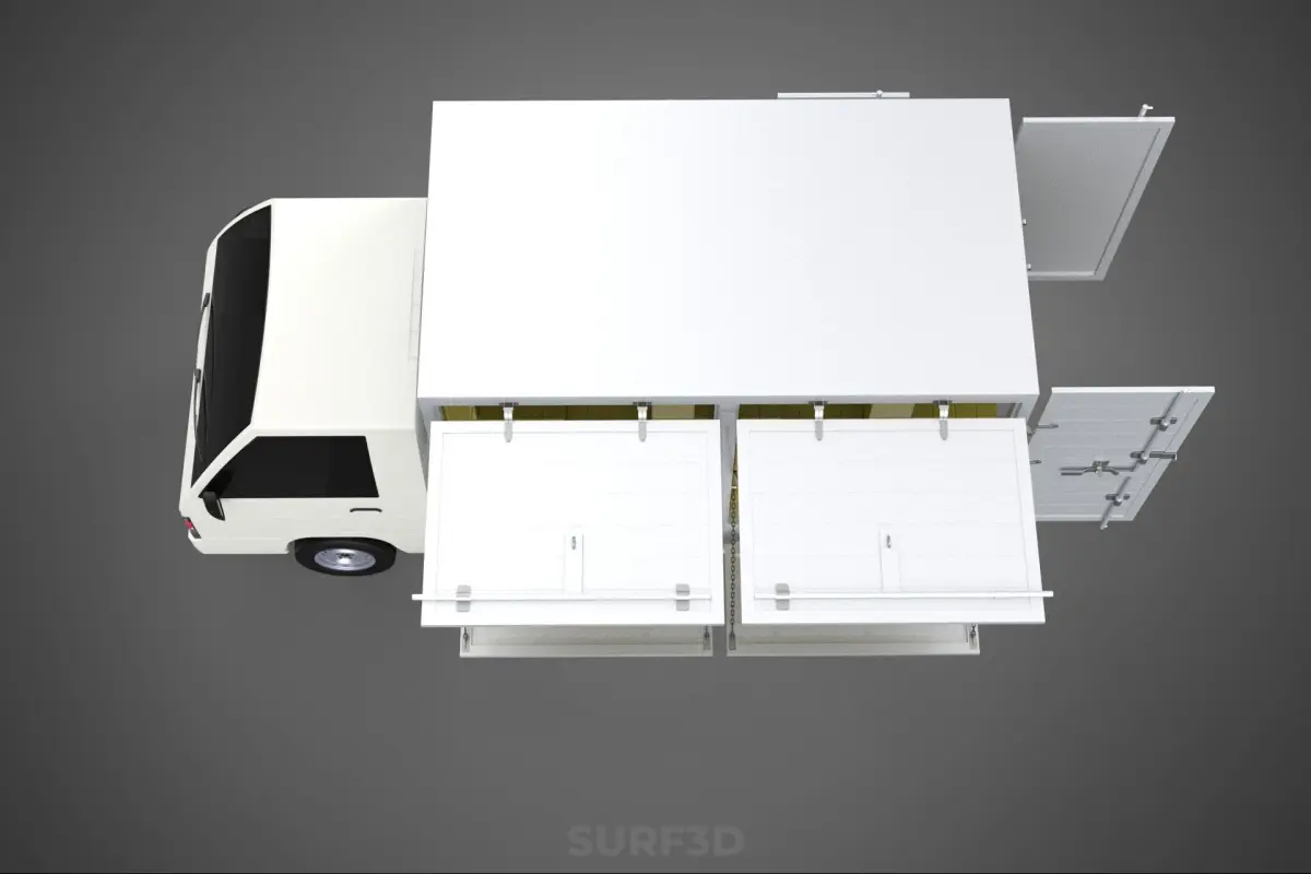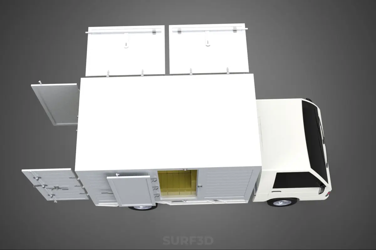 The title implies a vehicle concept focused on flexibility, suitable for applications requiring either enclosed volume or open flatbed capacity with easy multi-directional loading/unloading. It is not a standard model name but rather a functional description highlighting key features relevant to light-to-medium duty logistics, trade use, or specialized urban delivery scenarios.