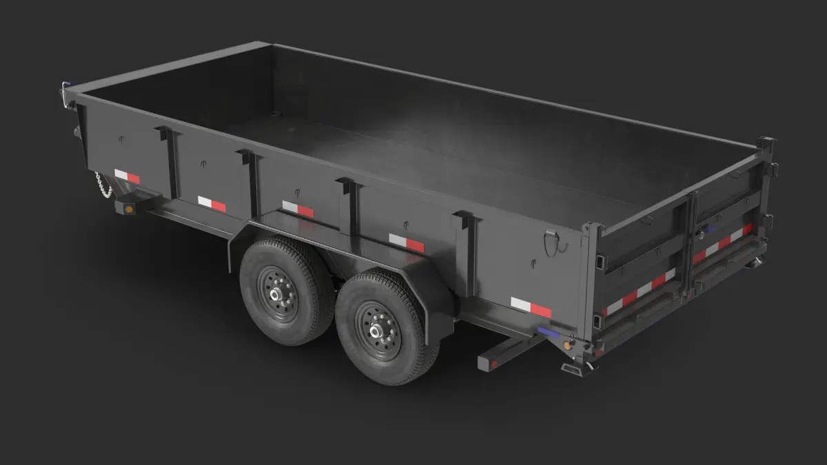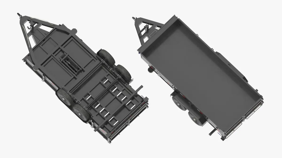 Utility Dump Trailer a specialized trailer designed for transporting and unloading bulk materials such as gravel, soil or construction waste, as well as machinery and equipment. It is equipped with a hydraulic system that allows you to lift and tilt the trailer body, facilitating the unloading of materials and ramps for loading and unloading equipment.
