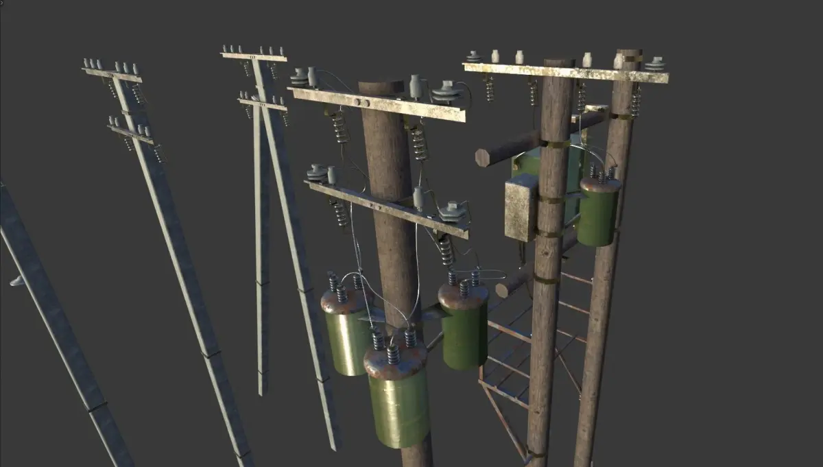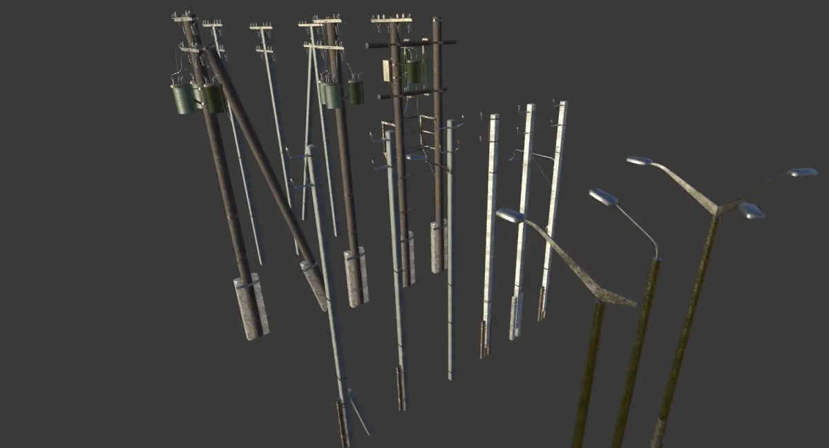 Game asset. Really simple pack of 15 electric poles(3 variants + light poles). They have some details on them, but really minimal for game. Textures are seamless 2k PBR easy to replaced if needed. Models are in separate files.Made in Blender for personal project.