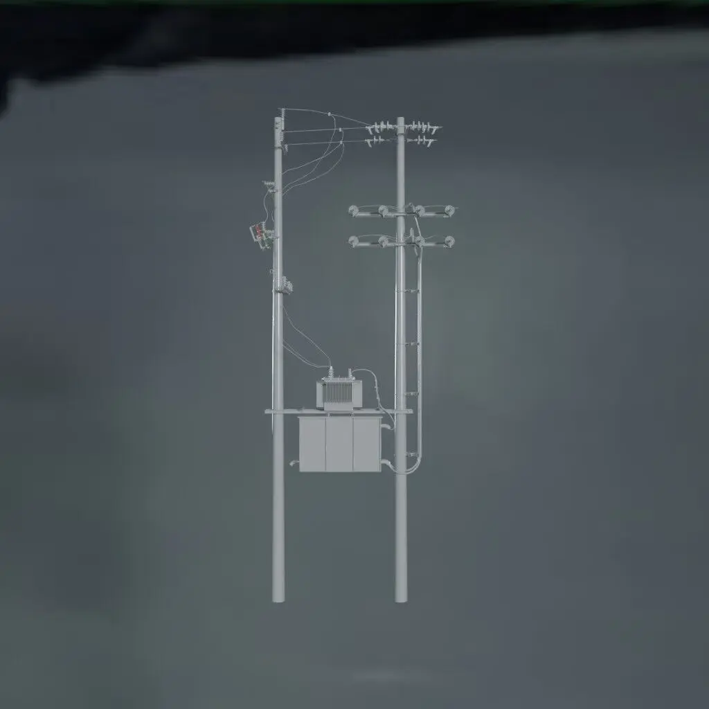 This 3D model features a utility pole setup with two concrete (cement) poles, insulators, and a transformer mounted between them. The model is provided in multiple formats, including Blender (BLB), GLB, and FBX, ensuring compatibility with various 3D software and game engines. It includes a disassembled parts script and animation to showcase the assembly and functionality of the components.