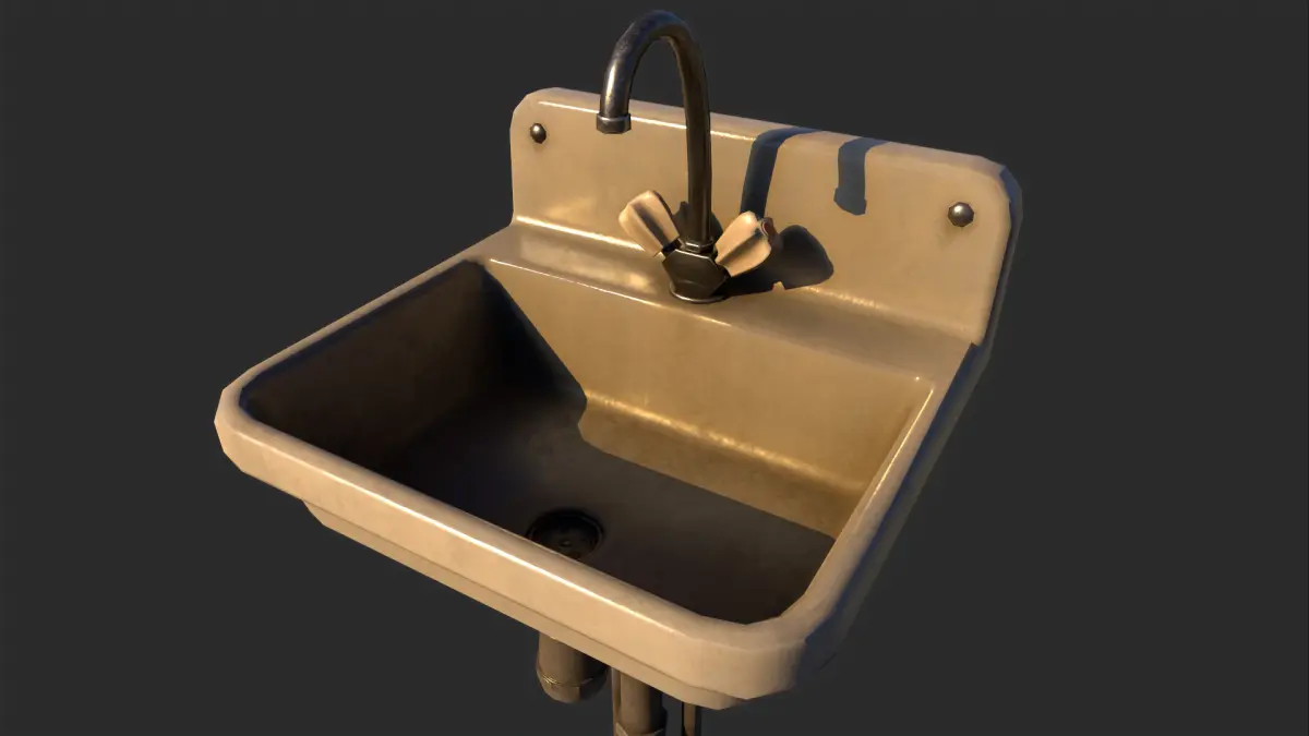 Game-ready 3D model of a wall-mounted utility sink with faucet and plumbing, ideal for workshops, garages, industrial or service environments.
