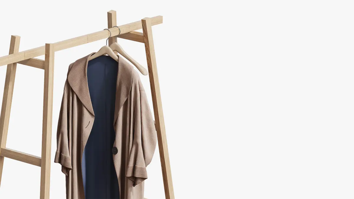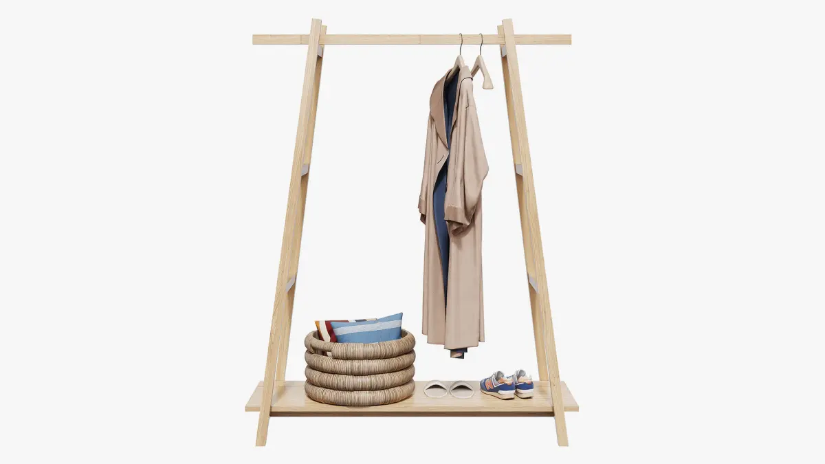 The set includes: floor hanger, coat, storage basket, slippers, snickers.
