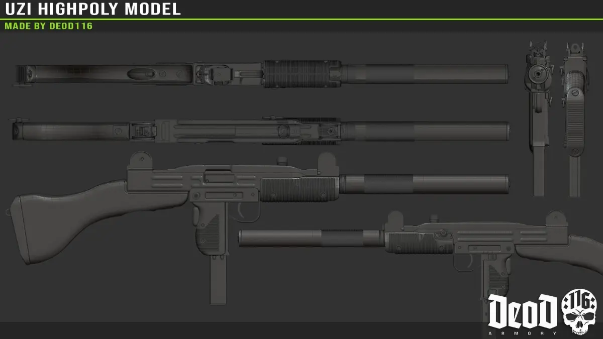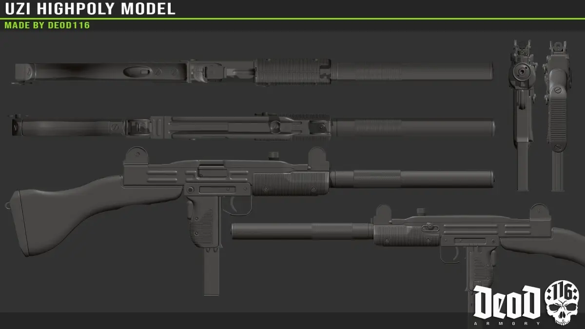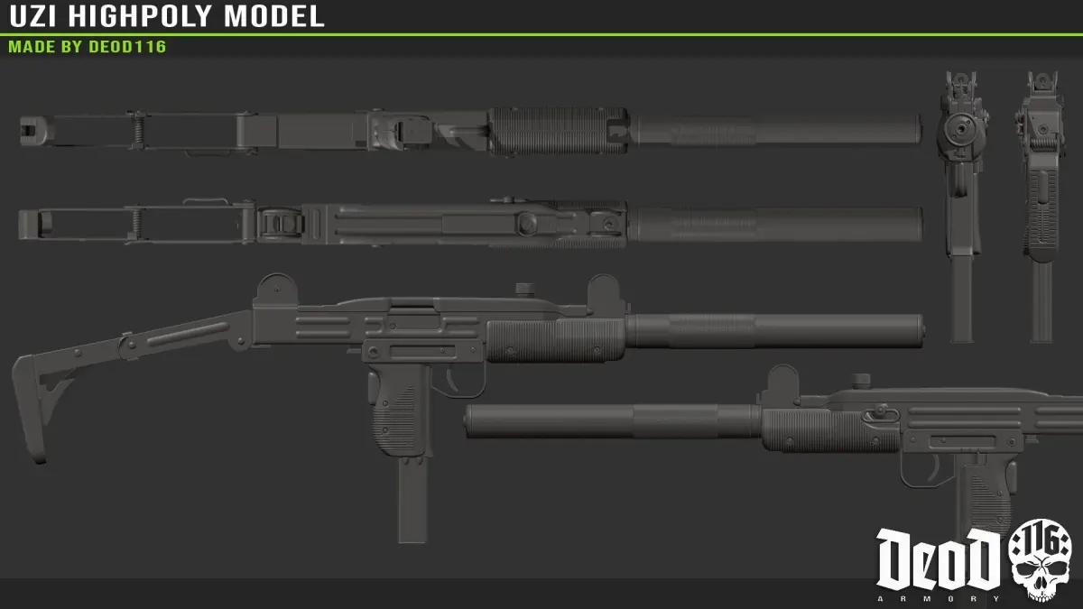 Highpoly model of UZI made in Blender.Includes obj, fbx and sourcefile.Contains: