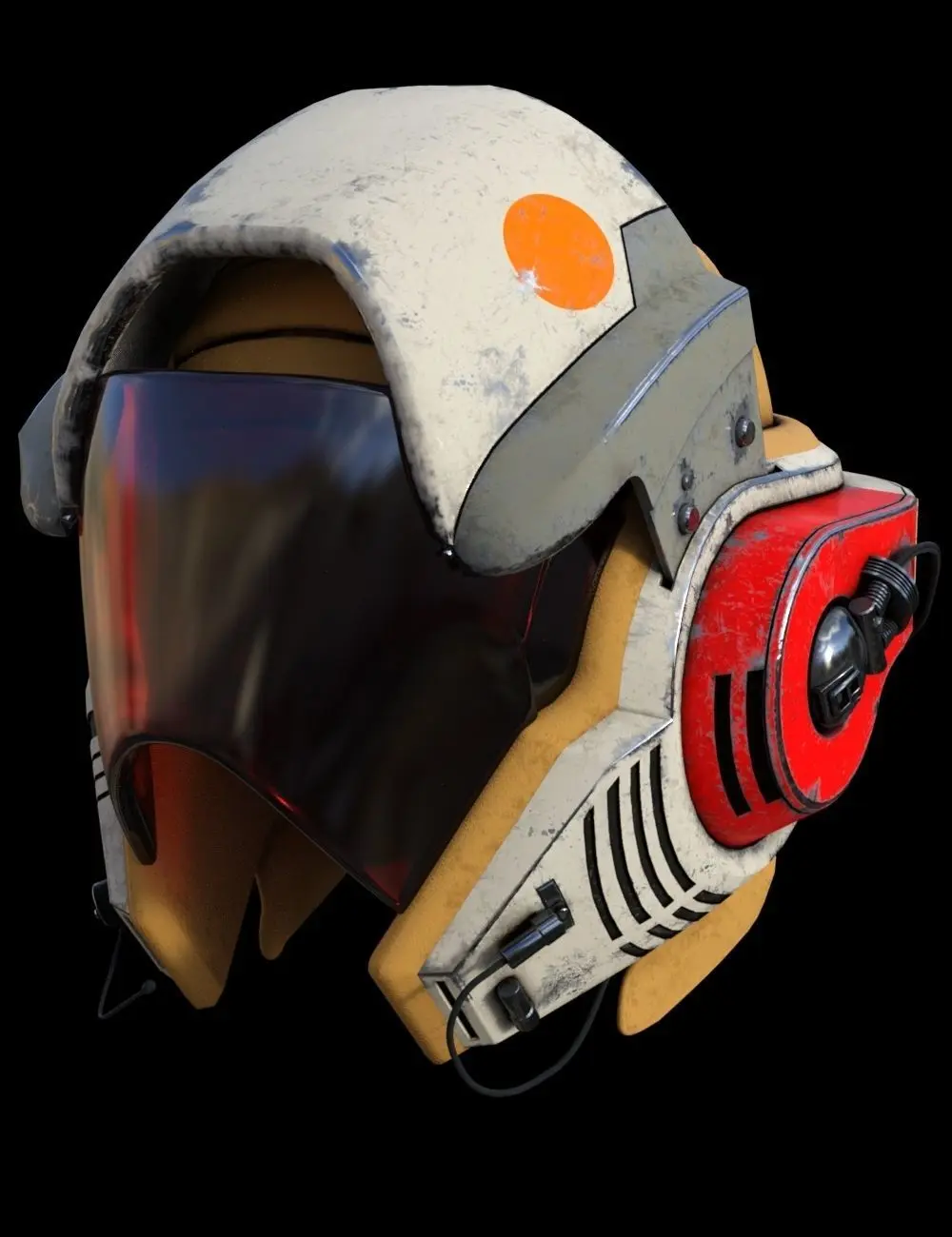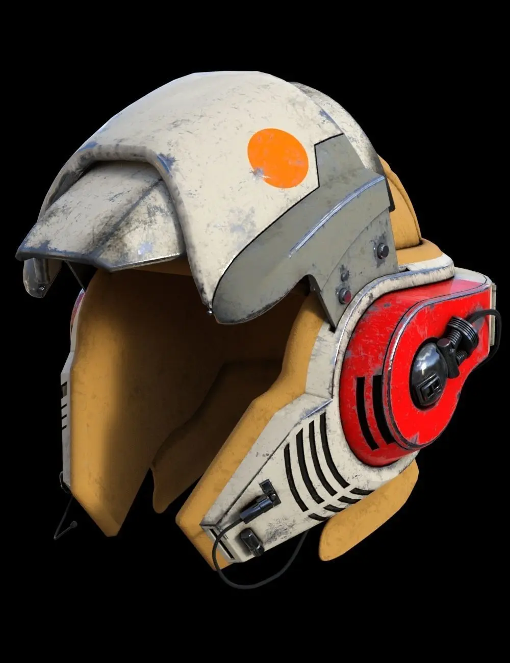 Starfighter Pilot Helmet design inspired by Star Wars concept art. Designed as a companion piece to the V-Wing Heavy Interceptor model. this helmet is designed for the pilots of this nimble little starfighter. The V-Wing design is an advanced heavy interceptor inspired by the aesthetic of the Star Wars Universe. To complement the advanced systems of this starfighter, the helmet that pilots use when flying this ship comes equipped with several experimental advanced features. Chief amongst these is an extensive Heads Up Display interface projected onto the voluminous visor of the helmet, this allows the fighter cockpit to use a more minimalist command console which frees up more space in the tight confines of the cockpit. The advanced helmet's systems also make use of eye-line tracking to allow the pilot to interact with the HUD interface systems at lightning-fast speeds in the blink of an eye, massively improving situational reaction times in the heat of battle.