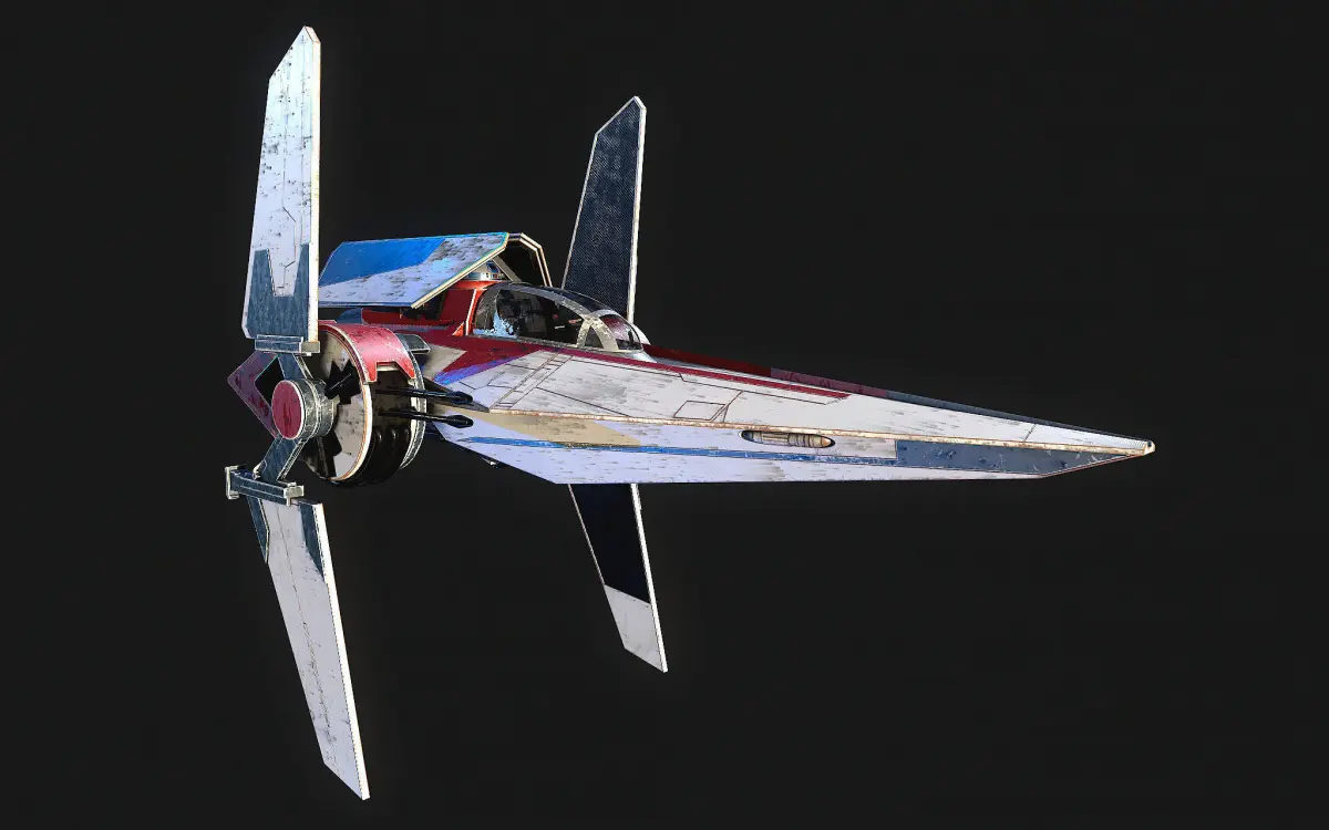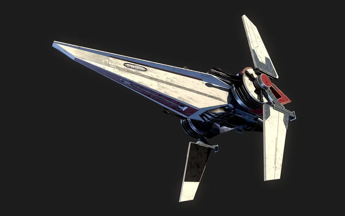 The V-wing had wing mounted laser cannons and had a wedge shape. The V-wings also featured folding wing radiators similar to those fitted on the later Eta-2 interceptors. Nestled between each wing and the hull were two twin laser cannons, which could swivel on the vessel’s wing hubs to provide a wide range of fire. Aft of the starfighter’s main hull were two deflector shield heat sinks, located above the two vertically stacked ion drive thrusters. These flaps also provided some protection for the V-wing’s clone pilot.