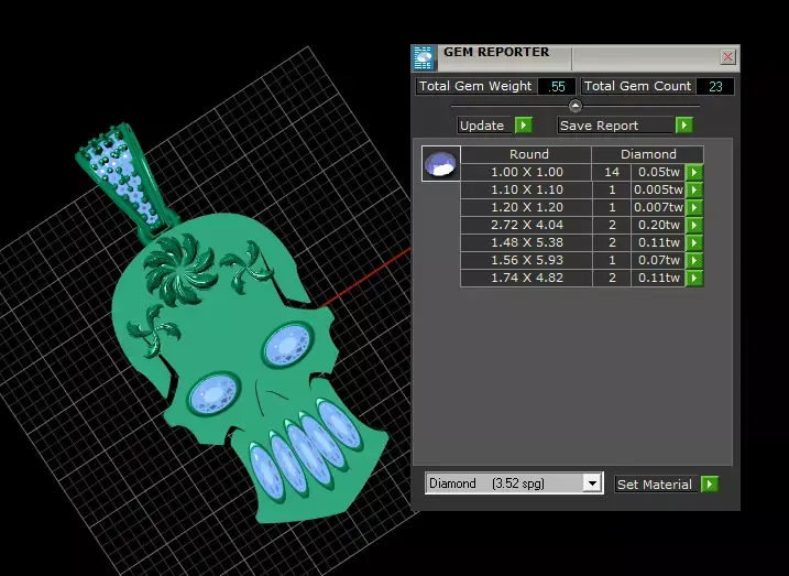 This is a detailed 3D model of a stylized V8 engine pendant, rendered in a polished, yellow gold material. The piece is a bold, artistic representation of a car engine, featuring a central crankshaft with two connecting rods and pistons. It is lavishly decorated with brilliant gemstones, which are set on the pistons, the main crankshaft, and the bail. The V-shaped engine block is also adorned with an intricate, repeating circular pattern.