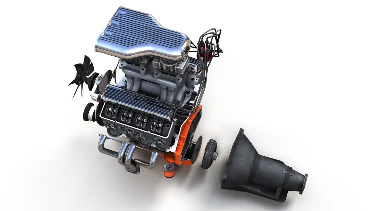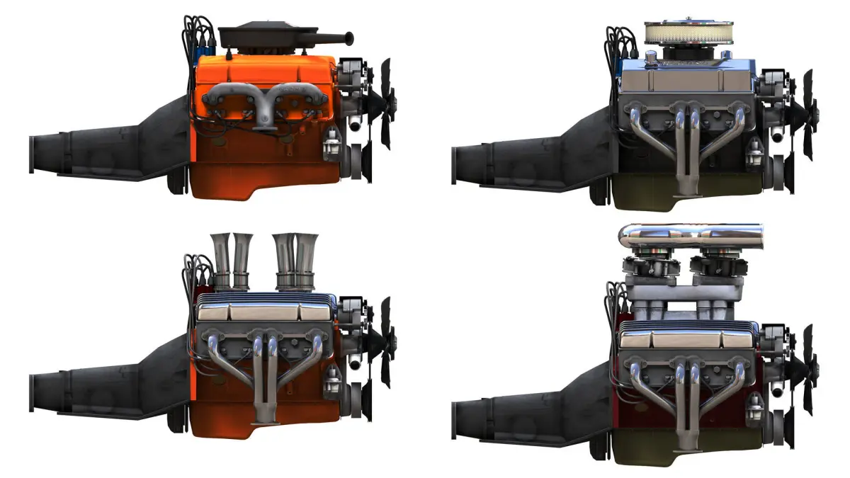 Vintage hotrod small block engine game ready model.Full textured high accuracy V8 engine model.This engine fits good with oldschool gassers and hotrods.Lot of details including factory part with orange paint and aftermarket parts - custom fuel systems air cleaners and head covers.
