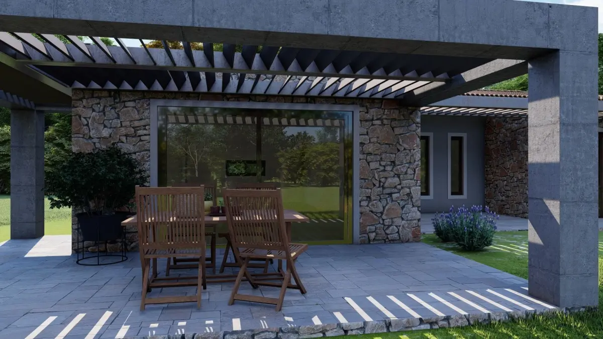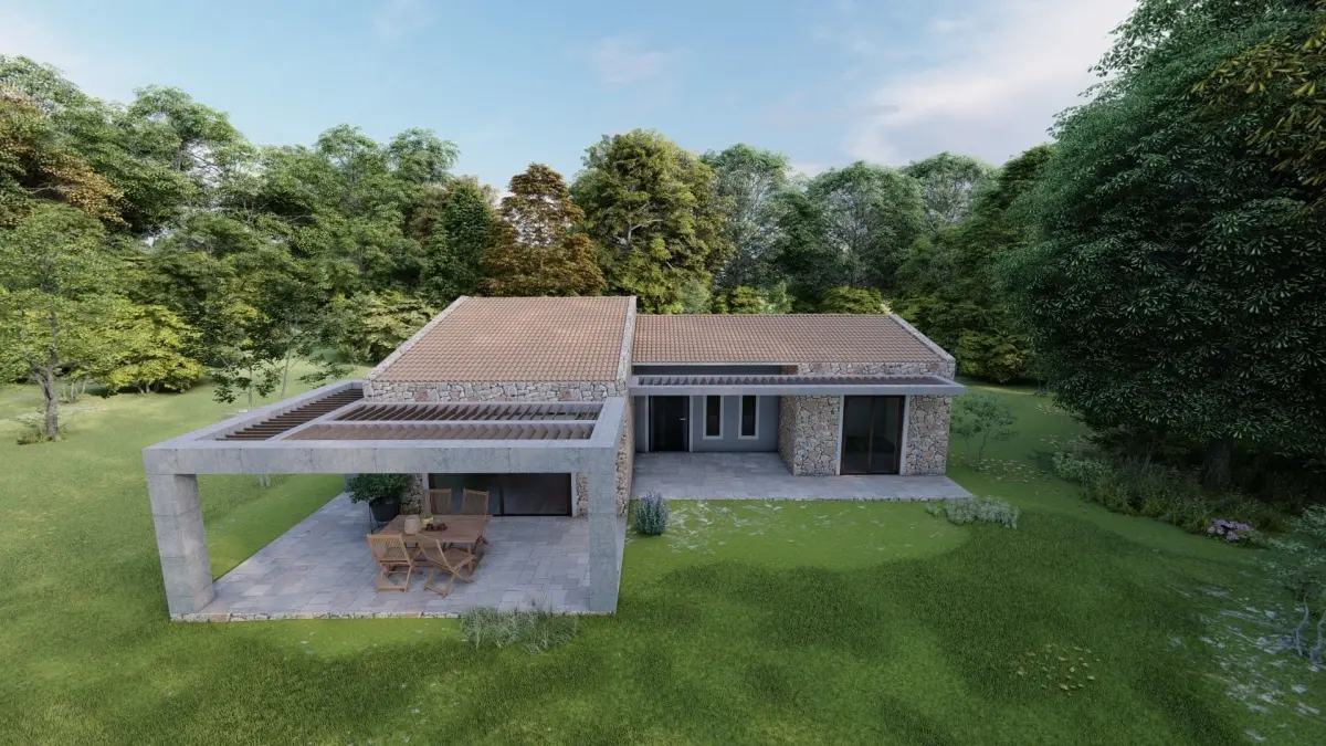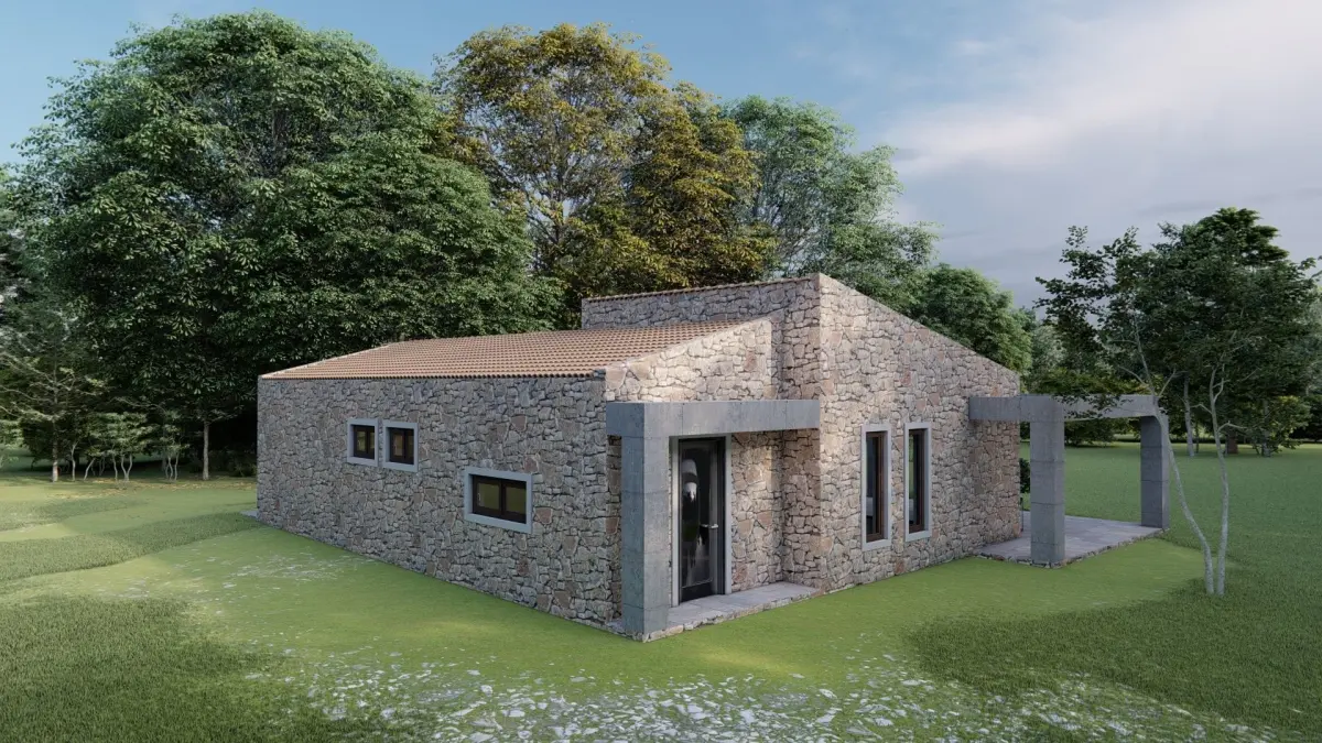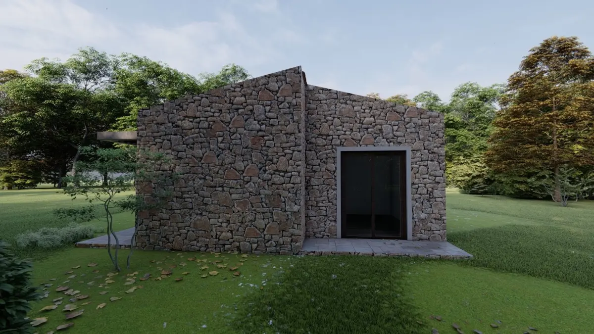 two bedroom house with great garden 3d model made by me feel free to use it and make adjustments. A grat mix of traditional materials with a more modern design. renders made with luminio 10.5 feel free to contact me if you need render services.