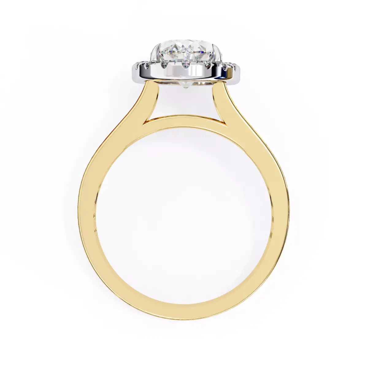 This stunning ring design blends modern elegance with premium detailing. The oval center diamond sits in a secure prong setting, surrounded by a diamond halo that enhances brilliance from every angle.The ring features a split-shank band, fully embellished with micro-pavé diamonds, creating a rich and sparkling aesthetic.