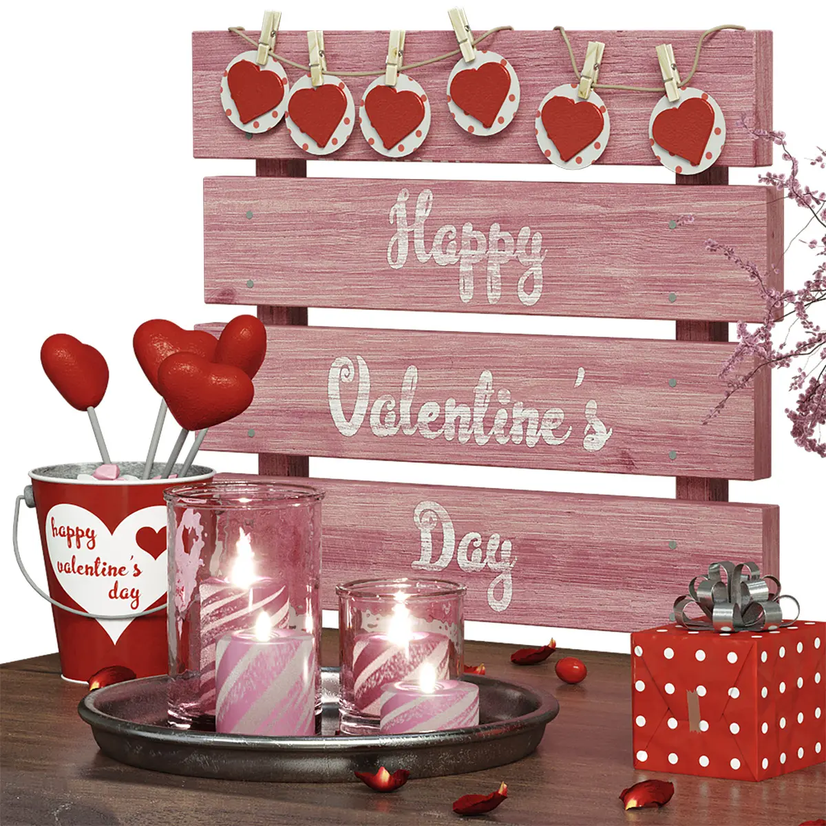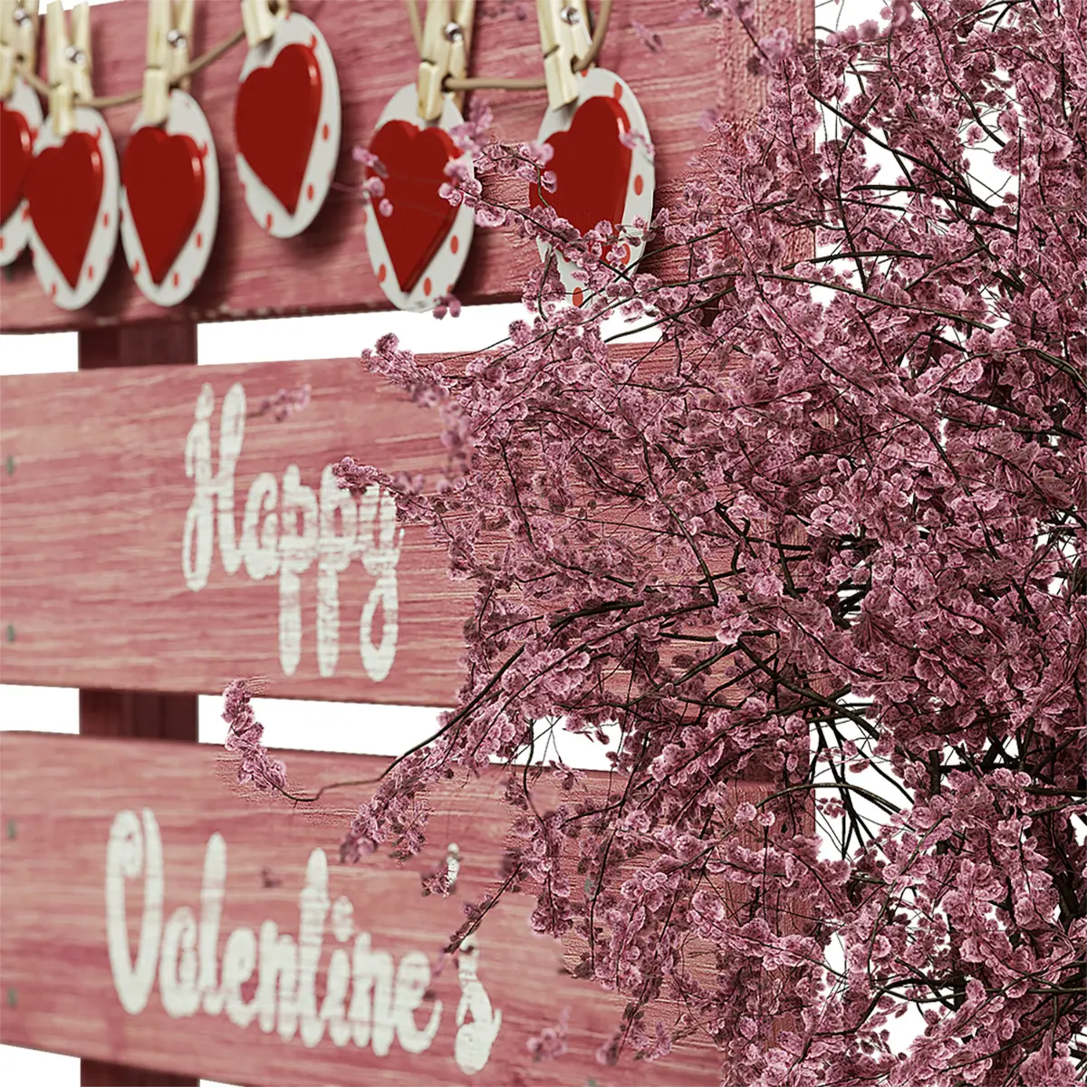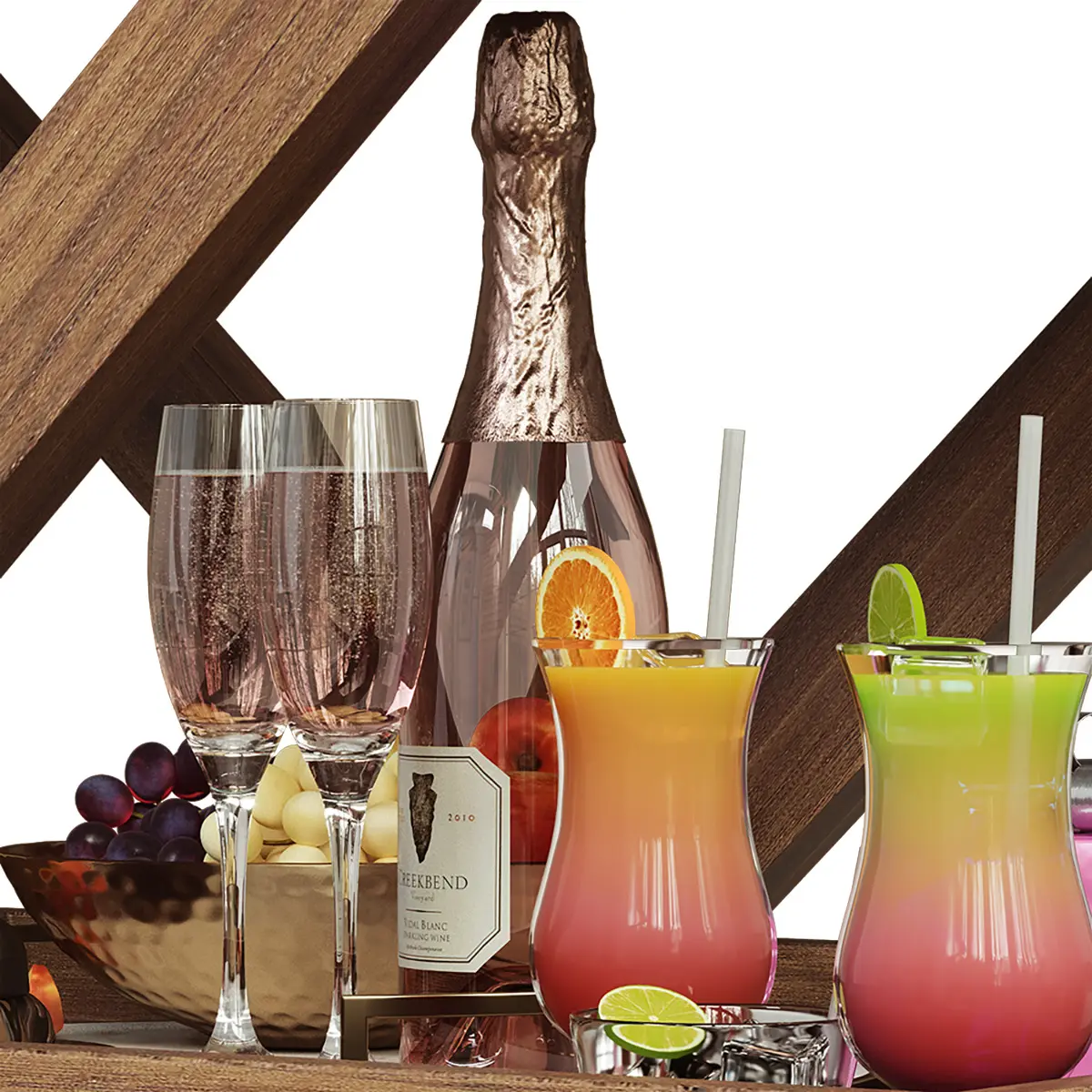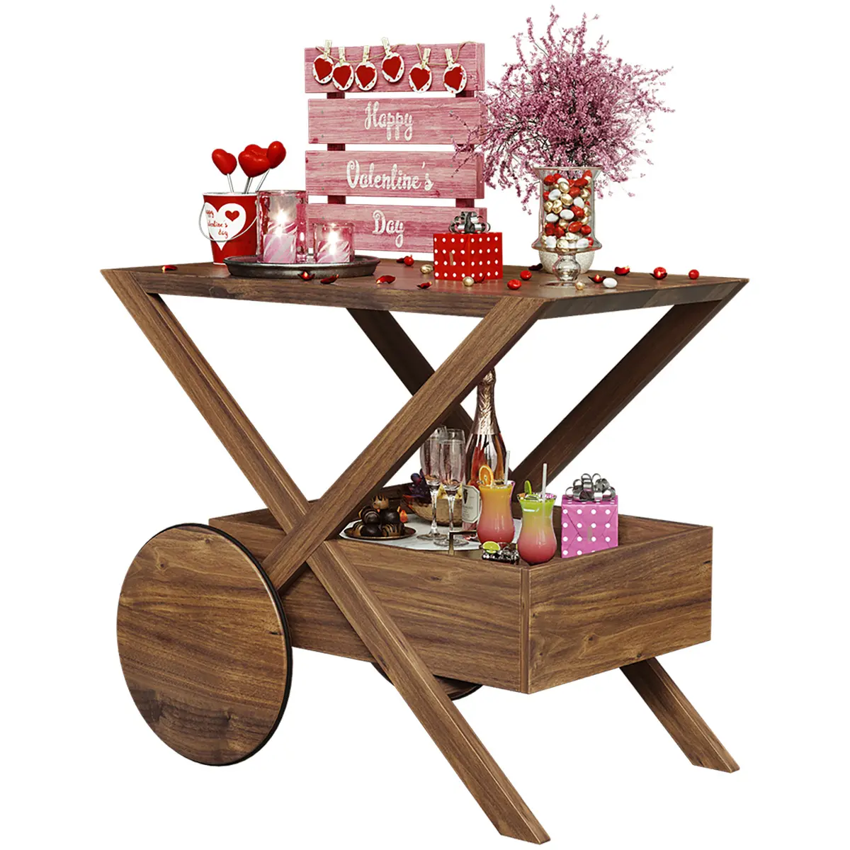 This high-quality 3D model features a stylish wooden serving cart decorated for a romantic Valentine’s Day celebration. The cart has a unique X-frame design with large circular wooden wheels and a lower shelf for additional storage.