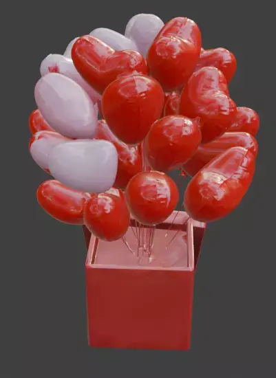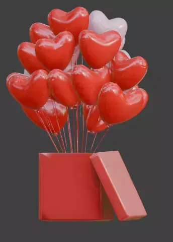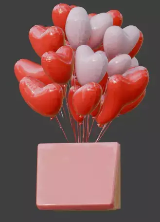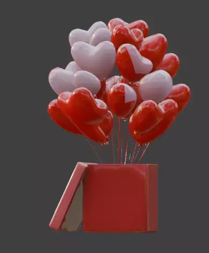 Features a collection of vibrant red and soft pink heart-shaped balloons emerging from a slightly open gift box.