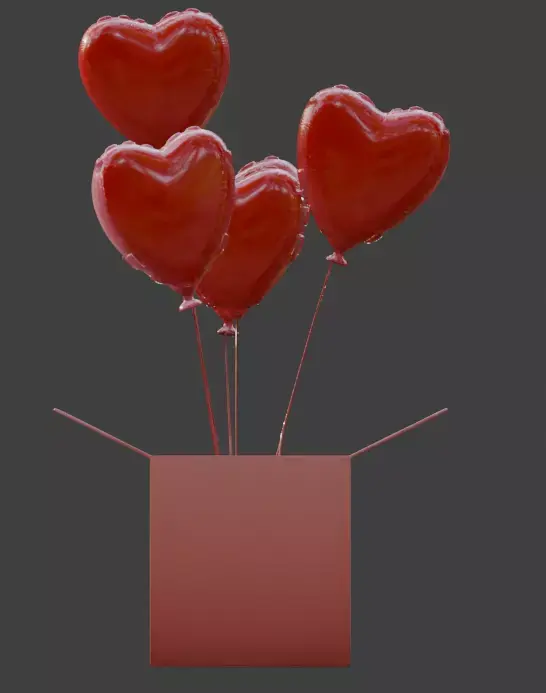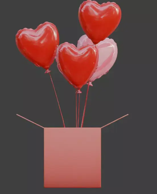 Features a collection of vibrant red and soft pink heart-shaped balloons emerging from a slightly open gift box.
