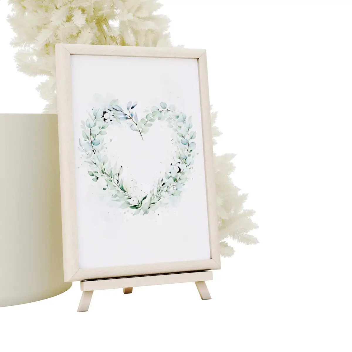 - A small wooden easel holds a framed heart graphic