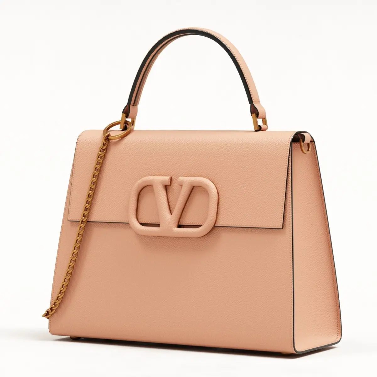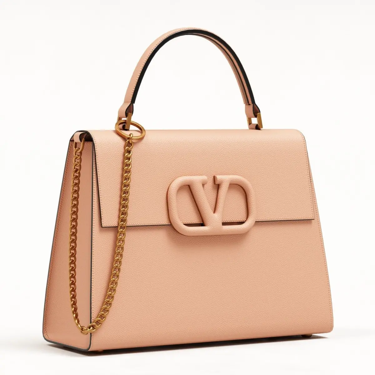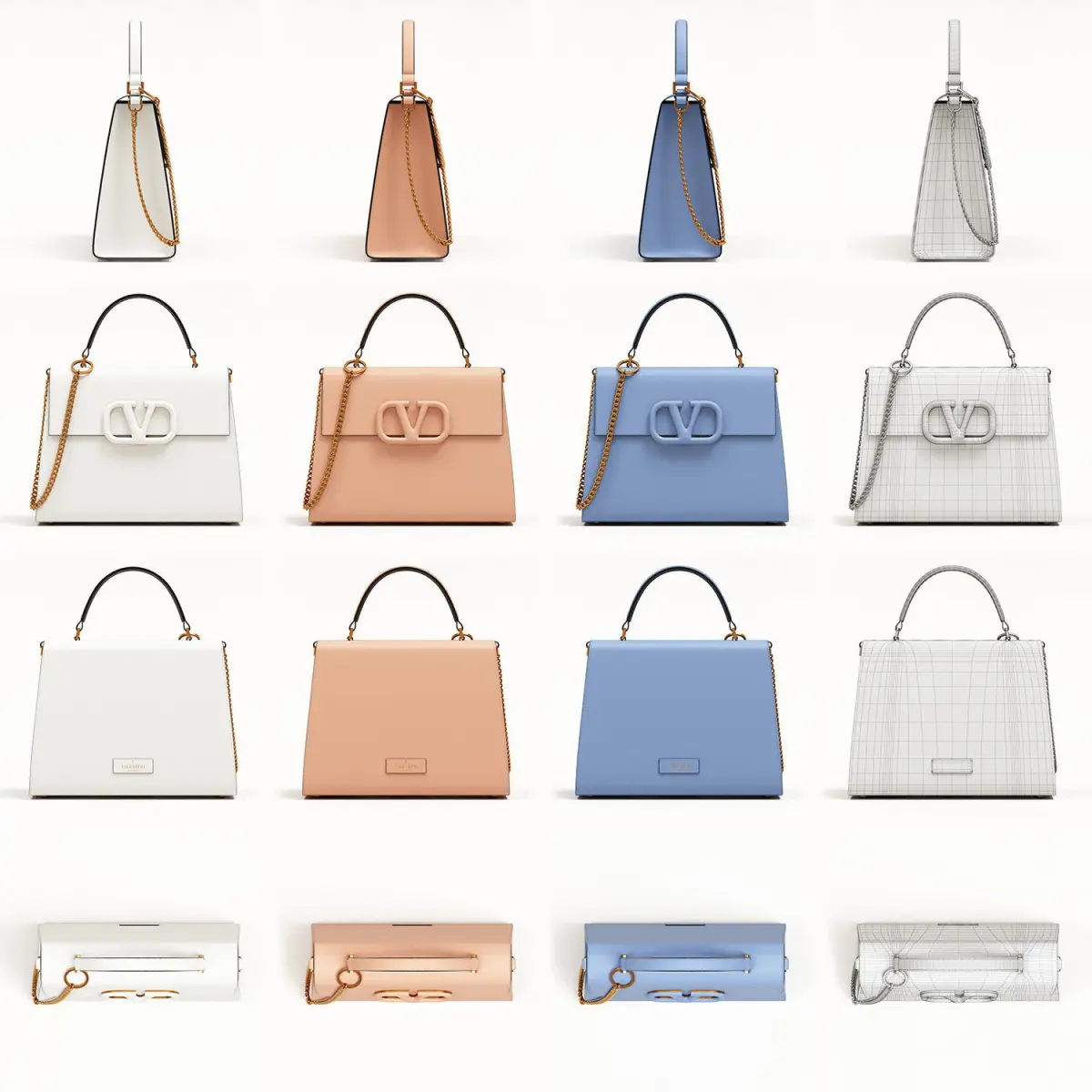 Three variants of Valentino Garavani Small VSLING Handbag in optic white, azure and rose cannelle grainy calfskin leather, with antique-brass-finish metal hardware.