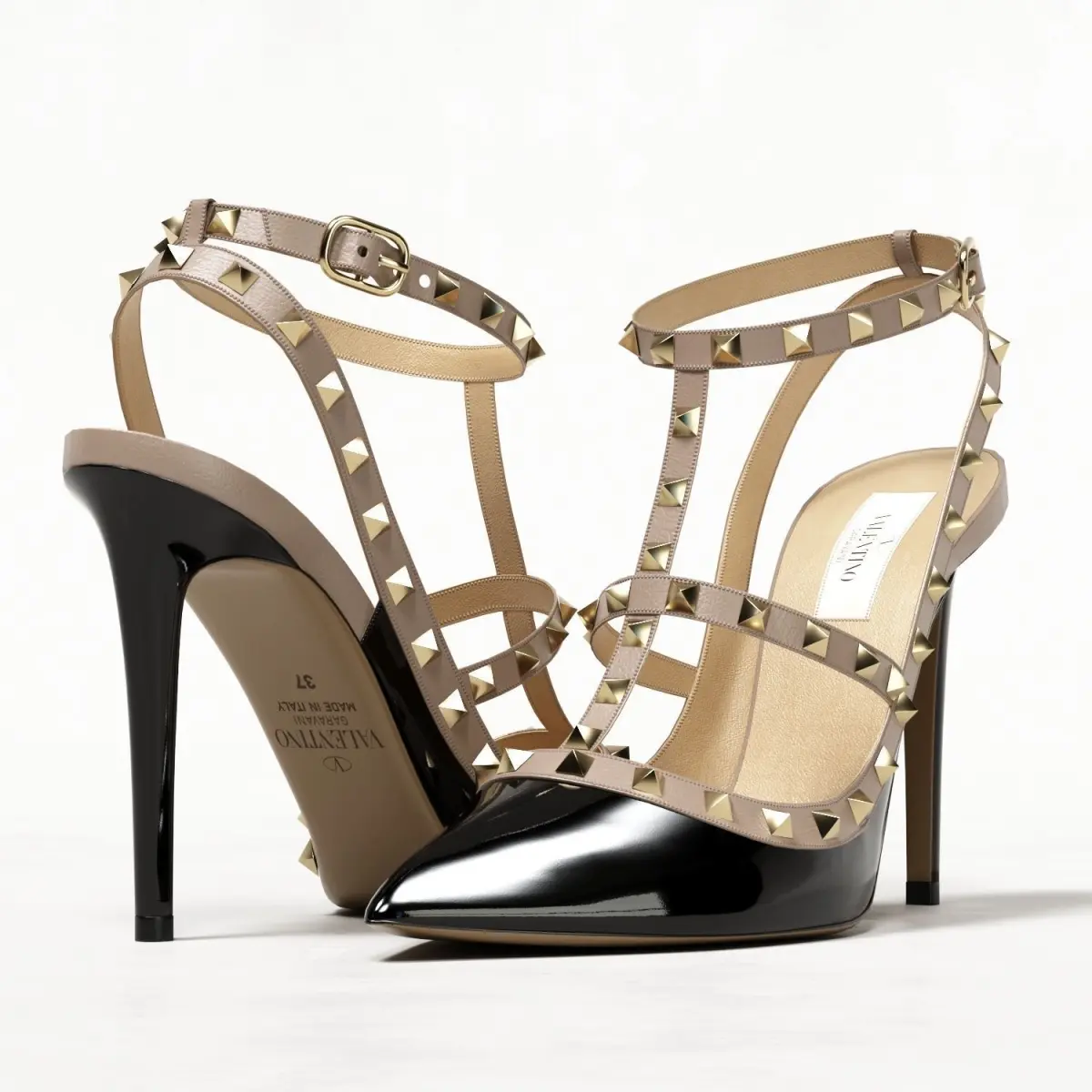 Three variants of Valentino Garavani Rockstud Caged 100mm Pumps in Black/Poudre, Light Ivory/Poudre and Poudre Patent Leather finish.