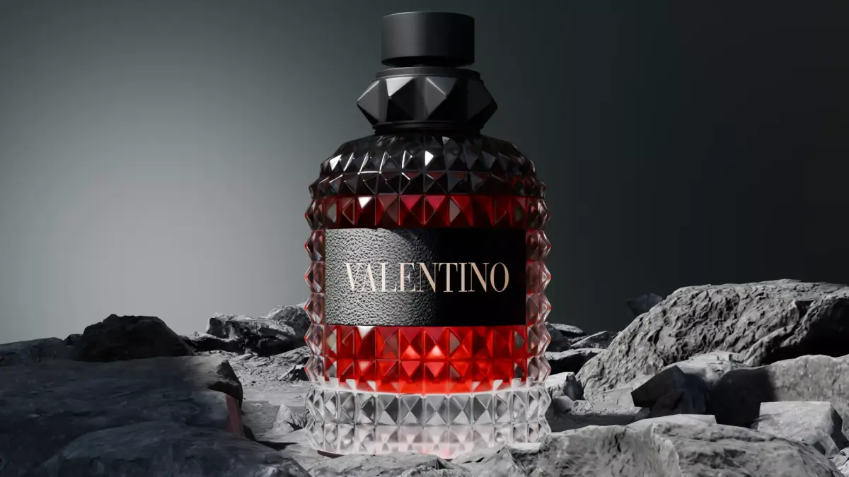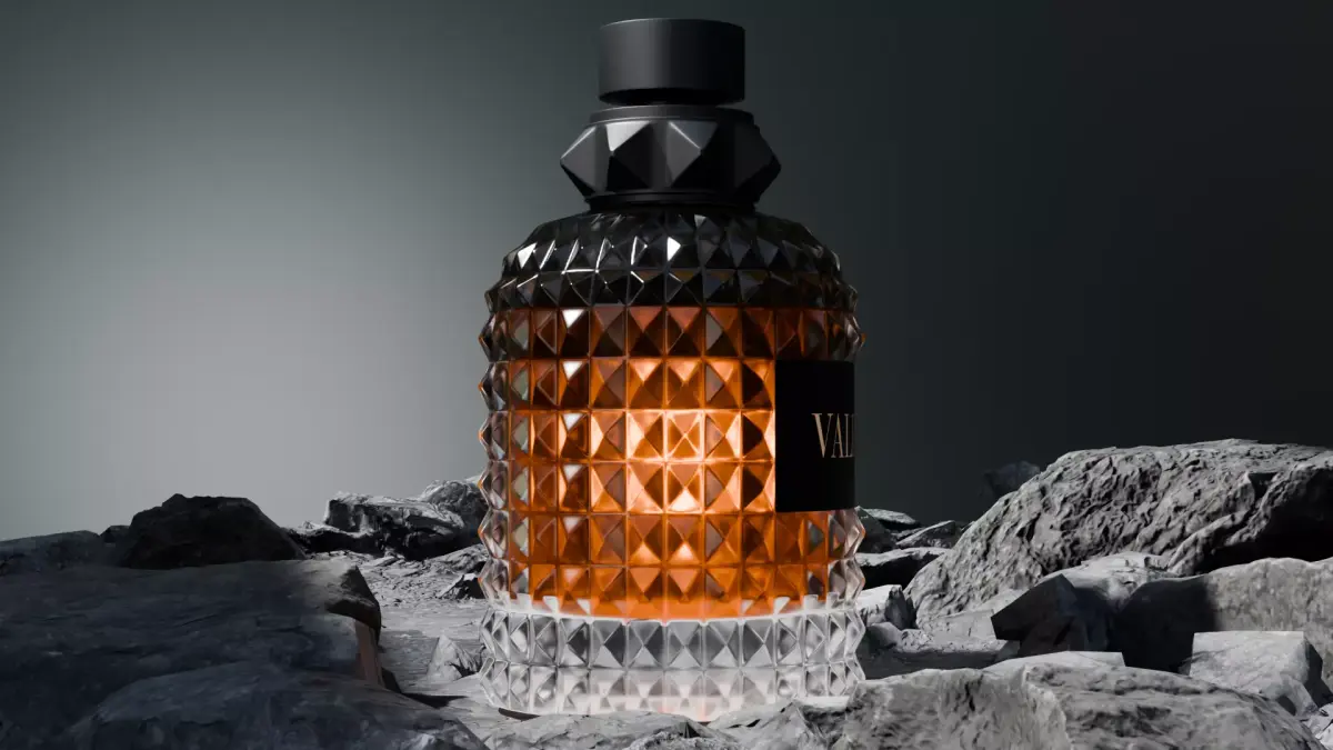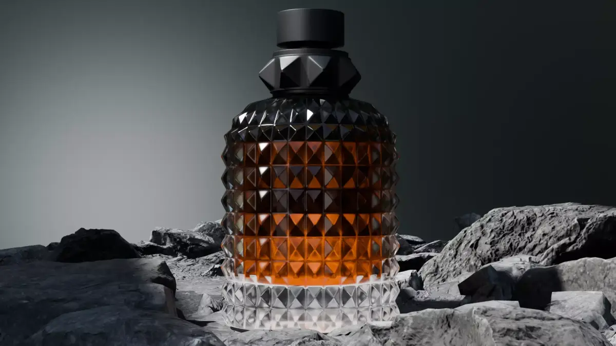 **Valentino Inspired Luxury Perfume Bottle 3D ModelBring sophistication and elegance to your scenes with this high-quality Valentino-inspired luxury perfume bottle 3D model. Designed with precision and attention to detail, this asset features a faceted glass design with a rich amber liquid interior and a matte black cap with pyramid stud elements — ideal for premium branding, cosmetic visualizations, product renders, and high-end animations.