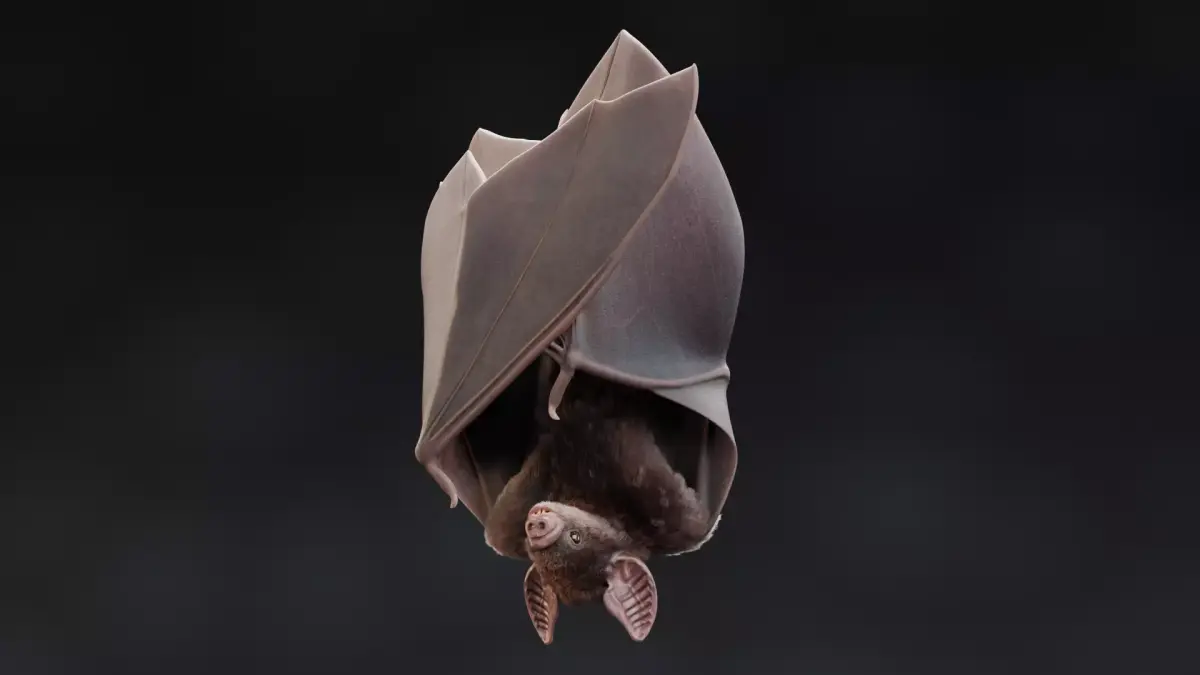 An anatomically accurate 3D model of a Desmodus rotundus vampire bat, built with clean, production-ready topology. Detailed modeling defines the wings, limbs, ears, and facial structure, including fully modeled fangs. Fine material definition enhances the leathery membranes and bone structure variation. Fur is included only in the Blender file. The model comes rigged with a standard Blender armature and is presented in a natural hanging pose, while remaining fully adjustable for flight or alternate poses.
