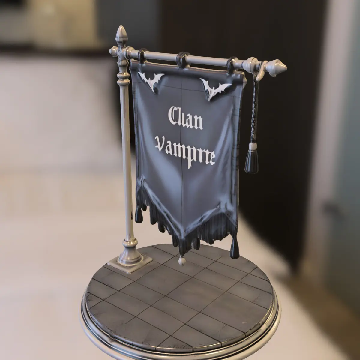 The Vampire Clan Banner is a gothic-themed 3D model designed to enhance horror, vampire, or medieval dark fantasy environments. Featuring aged, tattered fabric with stylized vampire bat accents and bold gothic lettering, it’s perfect for vampire covens, haunted castles, or cursed lands.