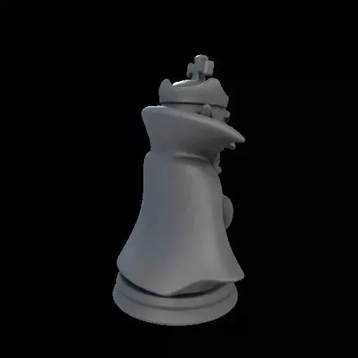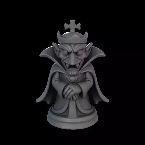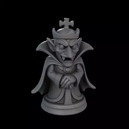 3D printable chess piece of a king figure reimagined as a vampire lord. The design features a spooky, cartoonish Halloween style with a flowing cape, sharp fangs, and regal, exaggerated facial details. The figure stands proudly on a reinforced round base, optimized for reliable 3D printing with smooth, simplified geometry and durable connections. Compact, sturdy, and stable design suitable for themed chess sets, Halloween displays, or collectible figurines. Neutral studio lighting, white background.