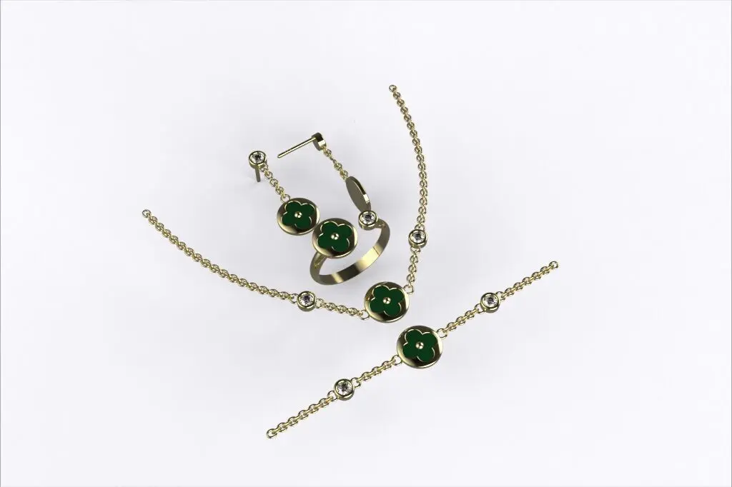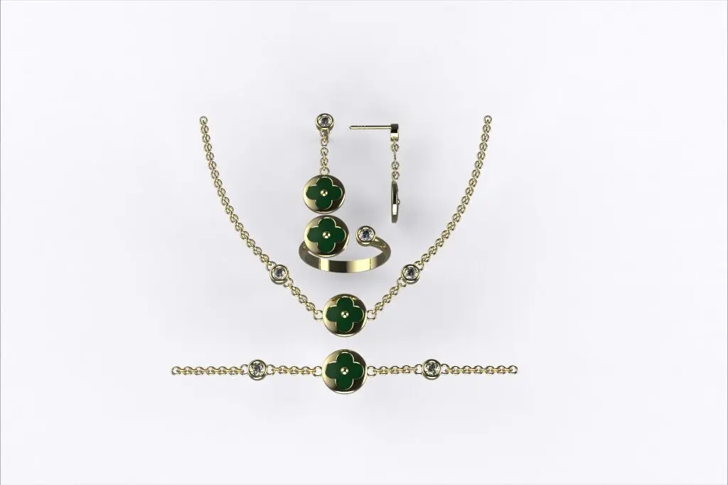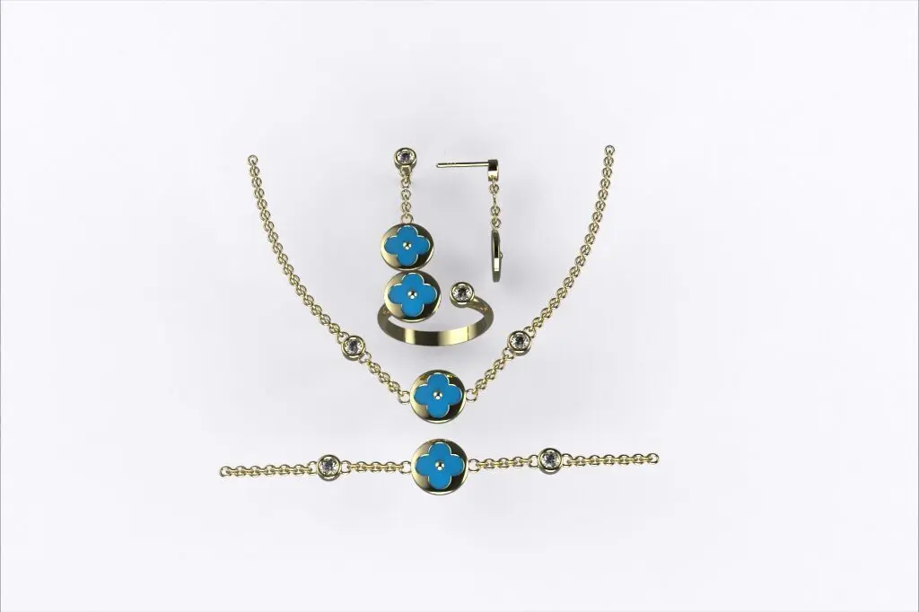 This refined 3D jewelry set showcases a signature four-leaf clover motif in vibrant turquoise blue, elegantly framed in polished 18K yellow gold. The ensemble includes a matching necklace, bracelet, earrings, and ring—each piece reflecting a harmonious balance between classic floral design and modern luxury. Inspired by the timeless Van Cleef aesthetic, this set brings charm, positivity, and sophistication. The model is fully ready for 3D printing and high-end rendering.