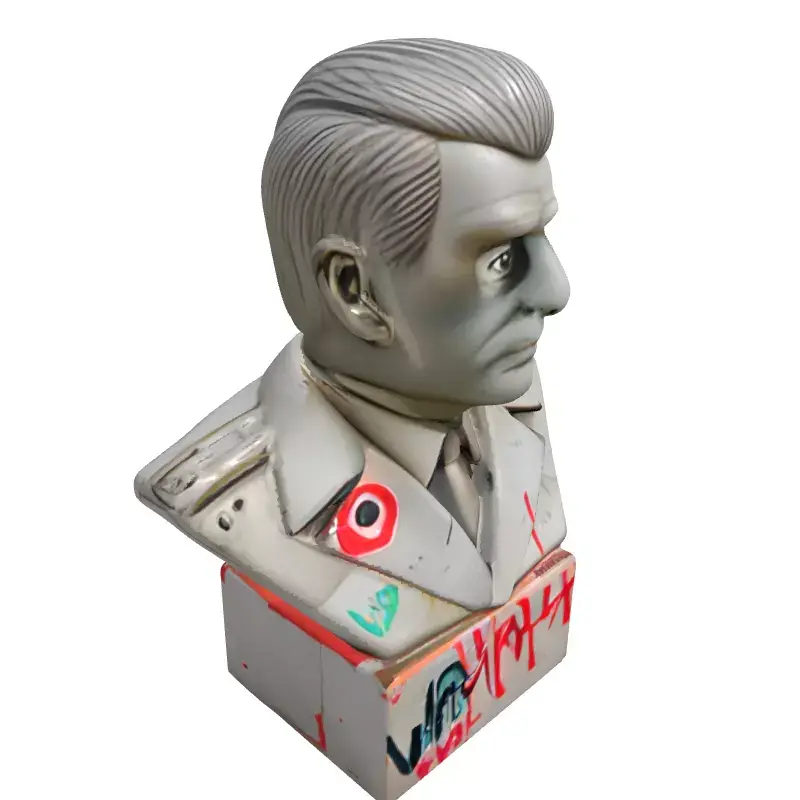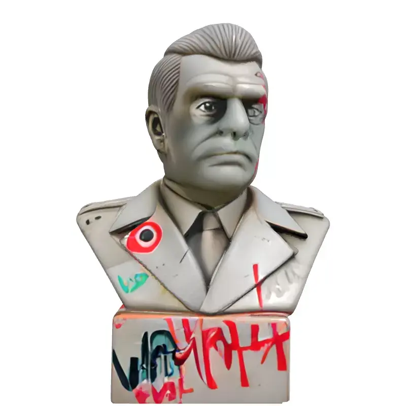 This is a meticulously crafted 3D model of a concrete bust, depicting a dignified general or military leader. The model stands out with its rebellious, urban art aesthetic, featuring realistic graffiti details. These include striking red paint splatters across the face and uniform, a bold red target symbol, a vibrant green 'led' tag, and an assertive red exclamation mark. Its robust base is further adorned with a stylized 'WARHOG' inscription, adding to its raw, street-art inspired character. Rendered in a durable concrete-like material, the model boasts high detail and clean, efficient topology, making it suitable for a variety of applications. It comes fully UV unwrapped and is designed to integrate seamlessly with PBR (Physically Based Rendering) texture workflows, ensuring realistic material representation under various lighting conditions. This versatile asset is perfect for enriching digital art projects, architectural visualizations, and creating compelling scenes in game development. Its unique character makes it ideal for urban environments, post-apocalyptic settings, protest scenes, or as a distinctive decorative element in modern interiors. The model is optimized for efficient real-time rendering, making it suitable for interactive experiences in AR (Augmented Reality) and VR (Virtual Reality) applications. Additionally, its high level of detail ensures stunning visual fidelity for static renders, film, and animation productions. Supported file formats typically include GLB, OBJ, FBX, USD, DAE, and ABC, providing broad compatibility across different 3D software platforms. While primarily designed for digital use, its solid structure could potentially be adapted for 3D printing with appropriate modifications to the intricate surface details. This asset offers a powerful blend of classical form and modern street artistry, providing a unique focal point for any digital project.