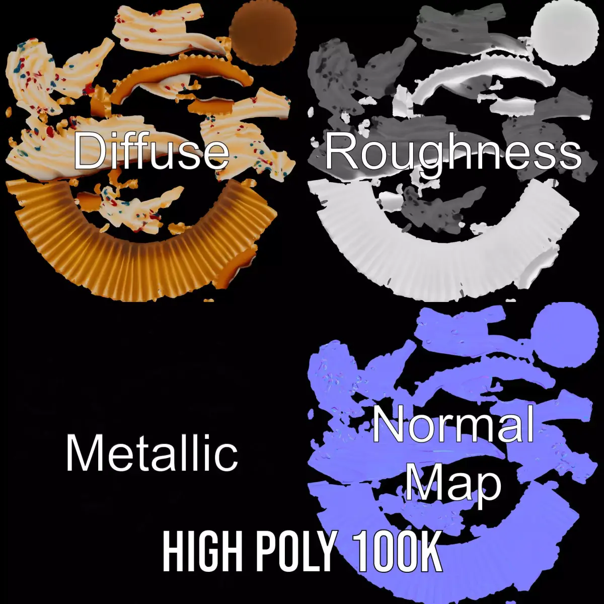 This Vanilla Cupcake Delight model pack features a beautifully detailed cupcake, complete with creamy frosting and colorful sprinkles. Ideal for culinary visualizations, game assets, or virtual bakery displays. Each model has 3 levels of detail: low-poly (1000 triangles for mobile), middle-poly (10,000 triangles for environment), and high-poly (100,000 triangles), which allows for the use of this model in production rendering (such as 3ds Max, Maya, Cinema4D, Blender, Vray/Corona/Cycles, and all other), game engines (Unity and Unreal compatible), and interactive presentations, providing a choice of detail based on the LOD System principle. The model's textures are PBR, Diffuse, NormalMap, and reflection/roughness/metallic, which are suitable for any modern rendering engine. All models accurately unwrapped and have no overlapping UV. Perfect for enhancing realistic environments in digital displays or adding visual interest to culinary projects. All textures are 4096*4096 in size. If you like this model, please leave a like and comment.