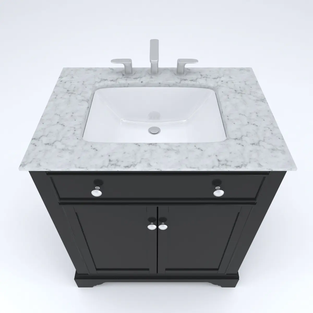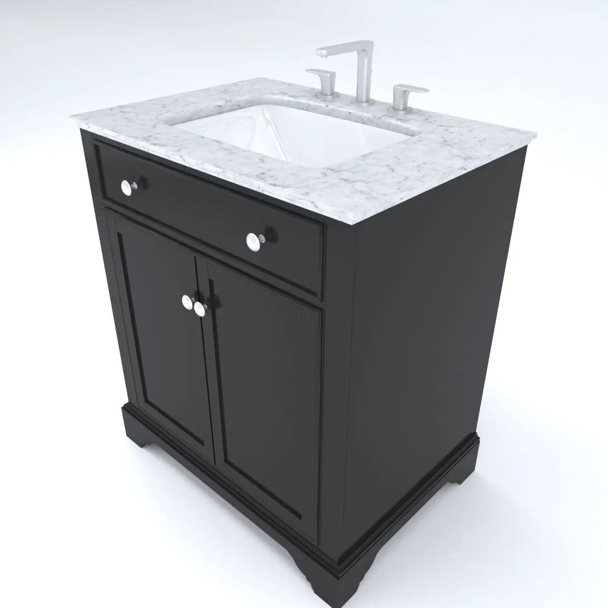 Vanity-002: Black Cabinet with Marble Countertop, Brushed Stainless sink, and Faucet.Cabinet has wood texture in bump for wood grain look