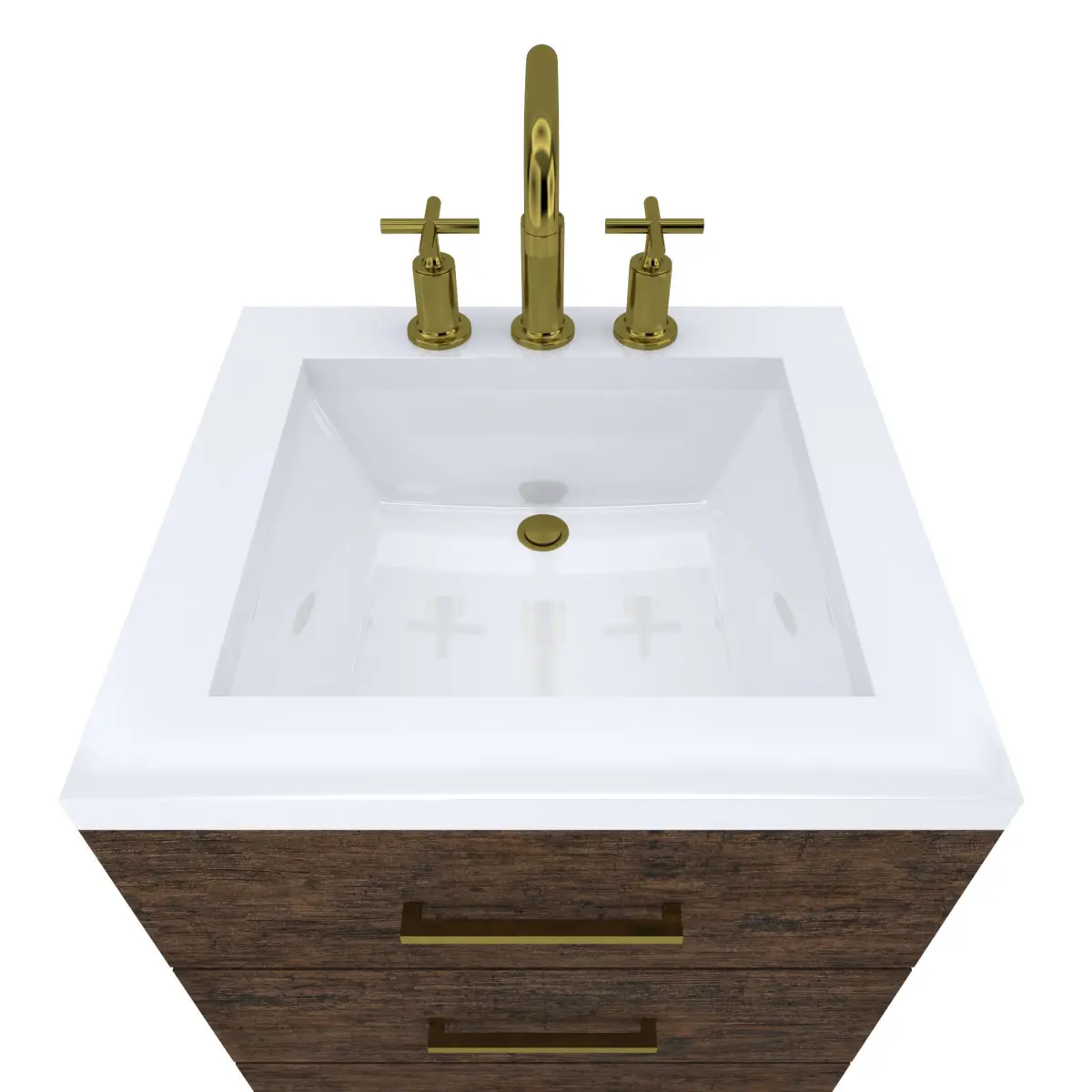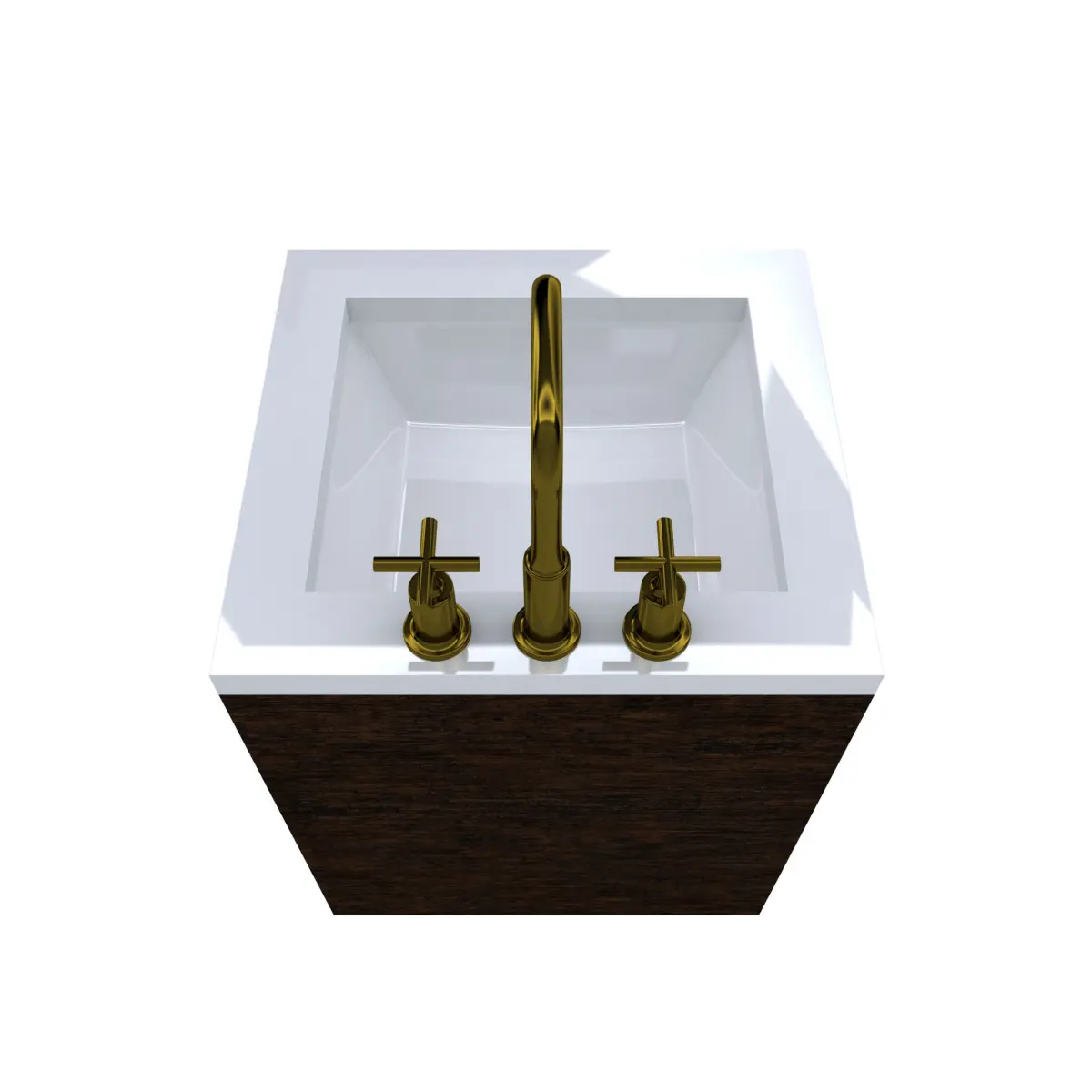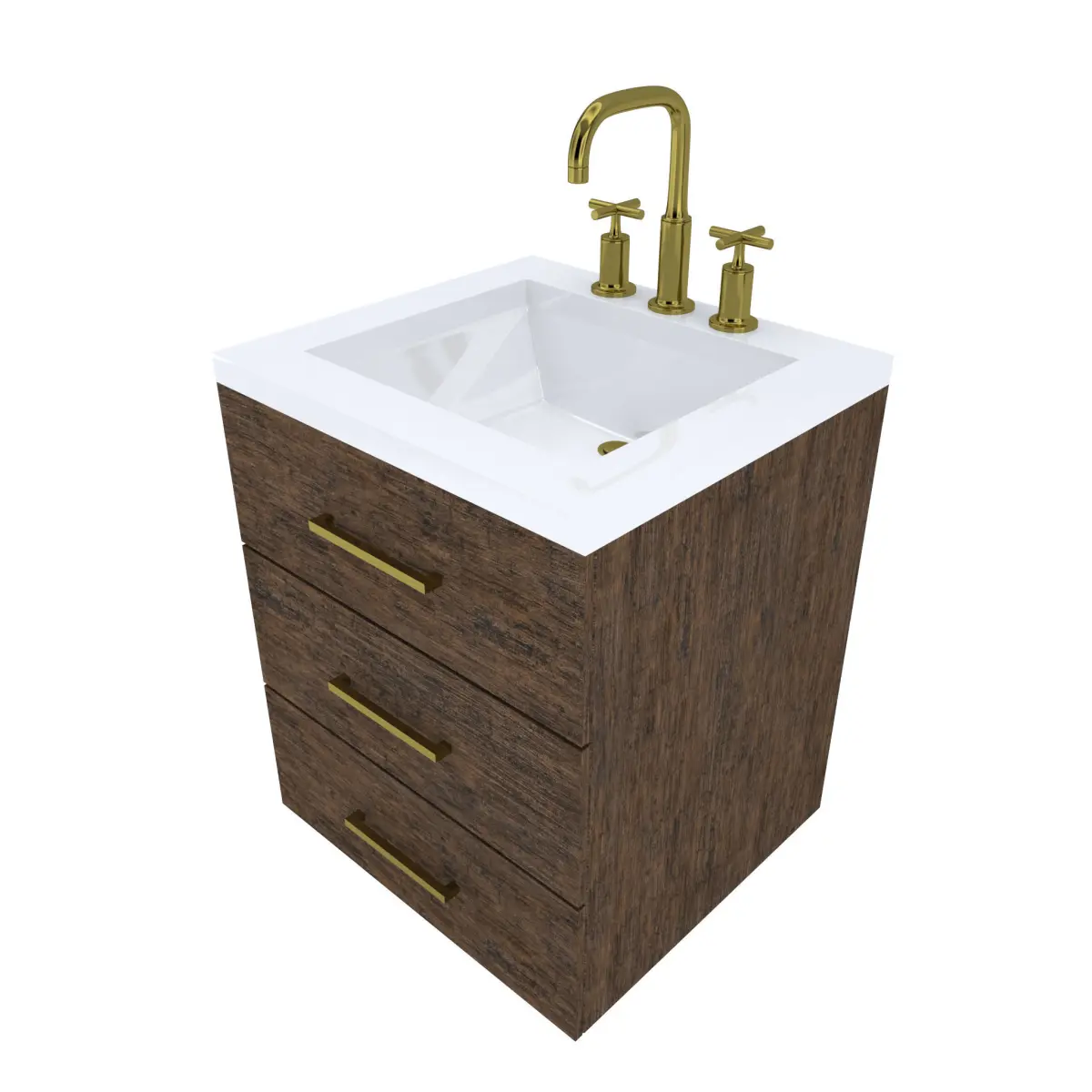 Wood Finish Cabinet with Gold Kohler Purist Faucet Modeled to Scale and Dimensions : 22D 24W x 28H (34 to top of Counter top)
